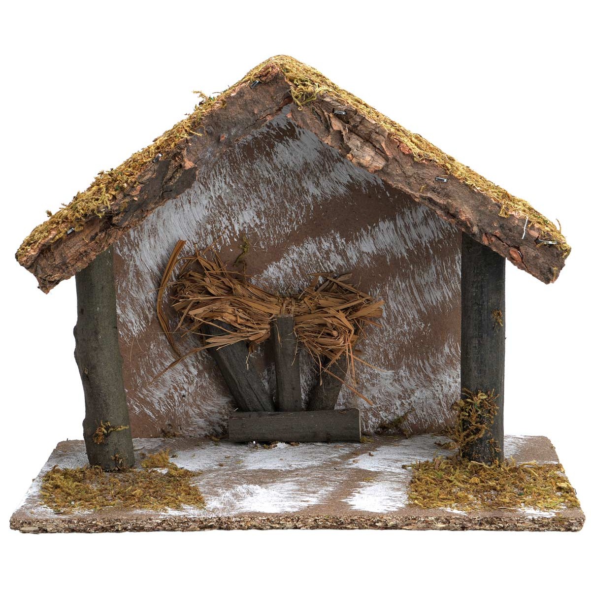 La cabaña presenta una estructura simple y rústica con techo inclinado y fondo abierto, pensada para acoger la escena de la Natividad y valorizarla dentro del pesebre.