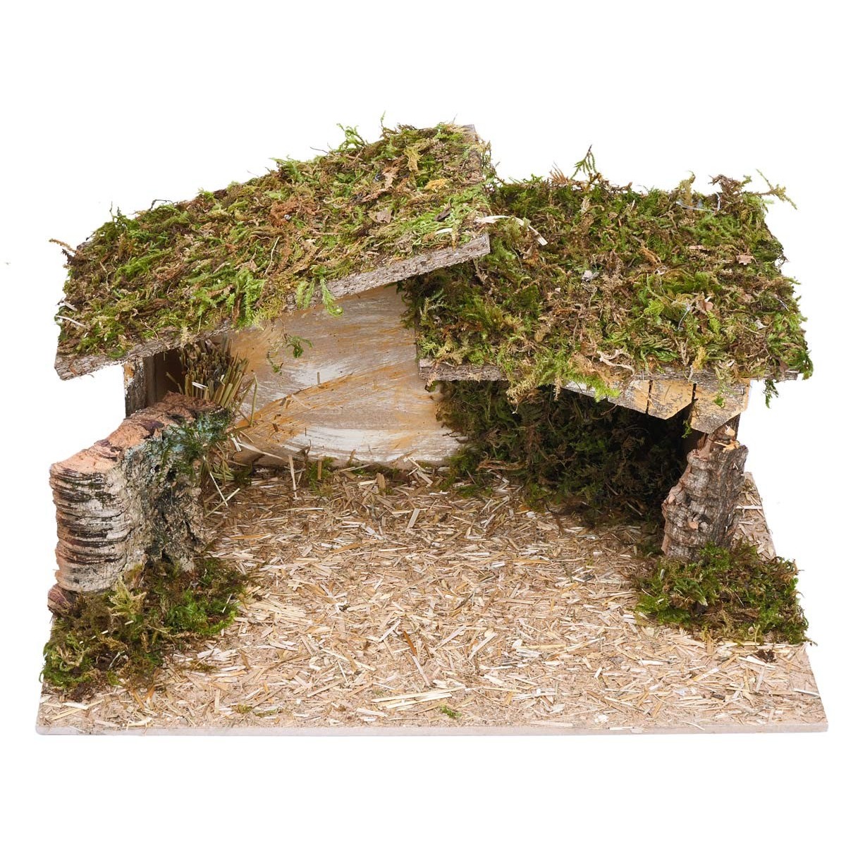 Las paredes laterales y traseras están trabajadas con acabados esenciales, mientras que la base se completa con paja y musgo para un conjunto equilibrado, ideal para el ambiente de la Natividad.