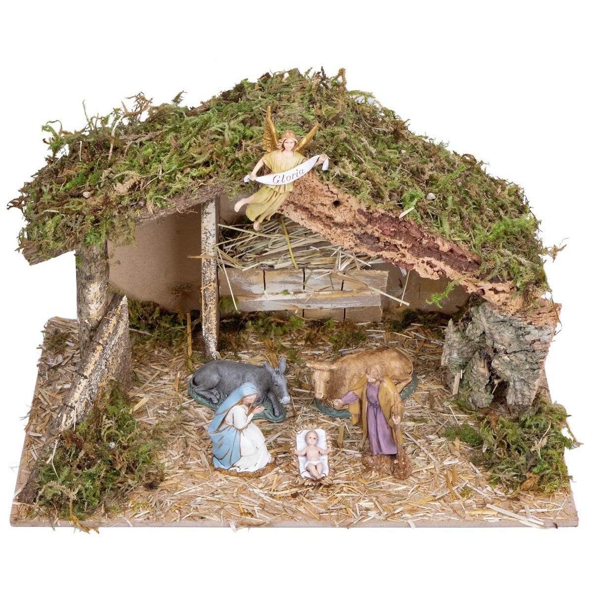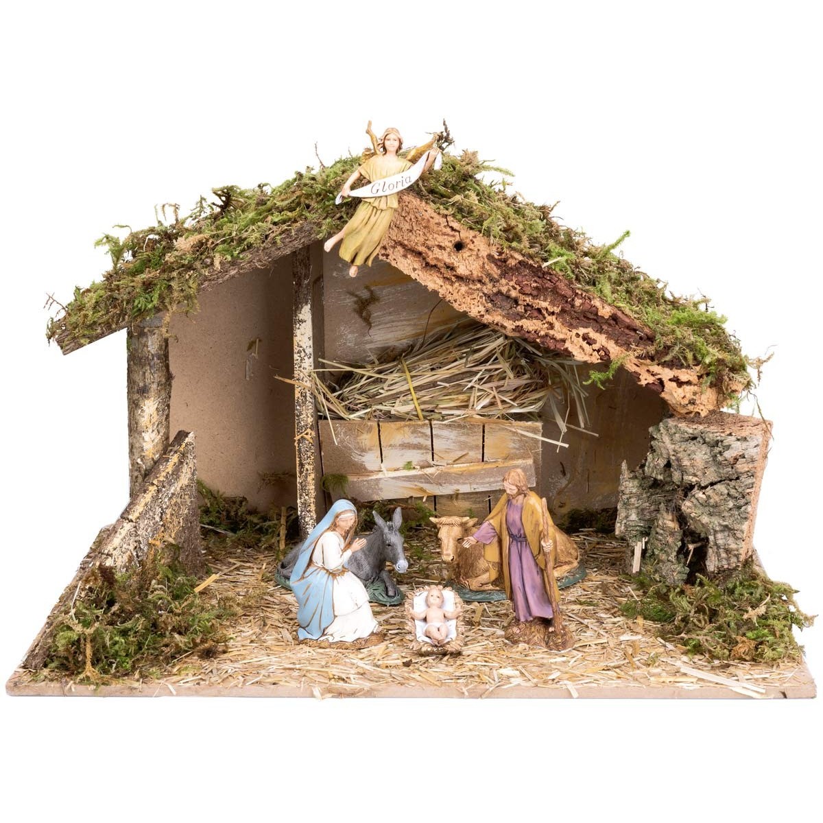 Cabaña con pesebre central lleno de paja, completa con Natividad a 6 personajes de la serie Landi Moranduzzo 10 cm.