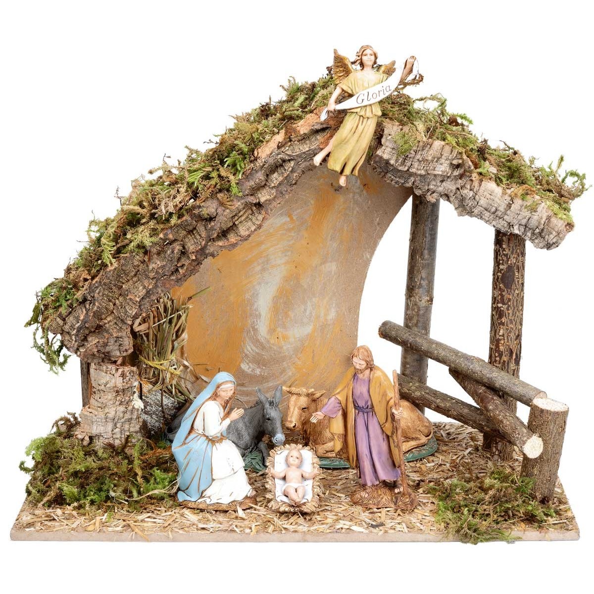 Cabaña con techo en corteza y apertura frontal, completa con natividad de 6 figuras de la serie Landi Moranduzzo 10 cm.
