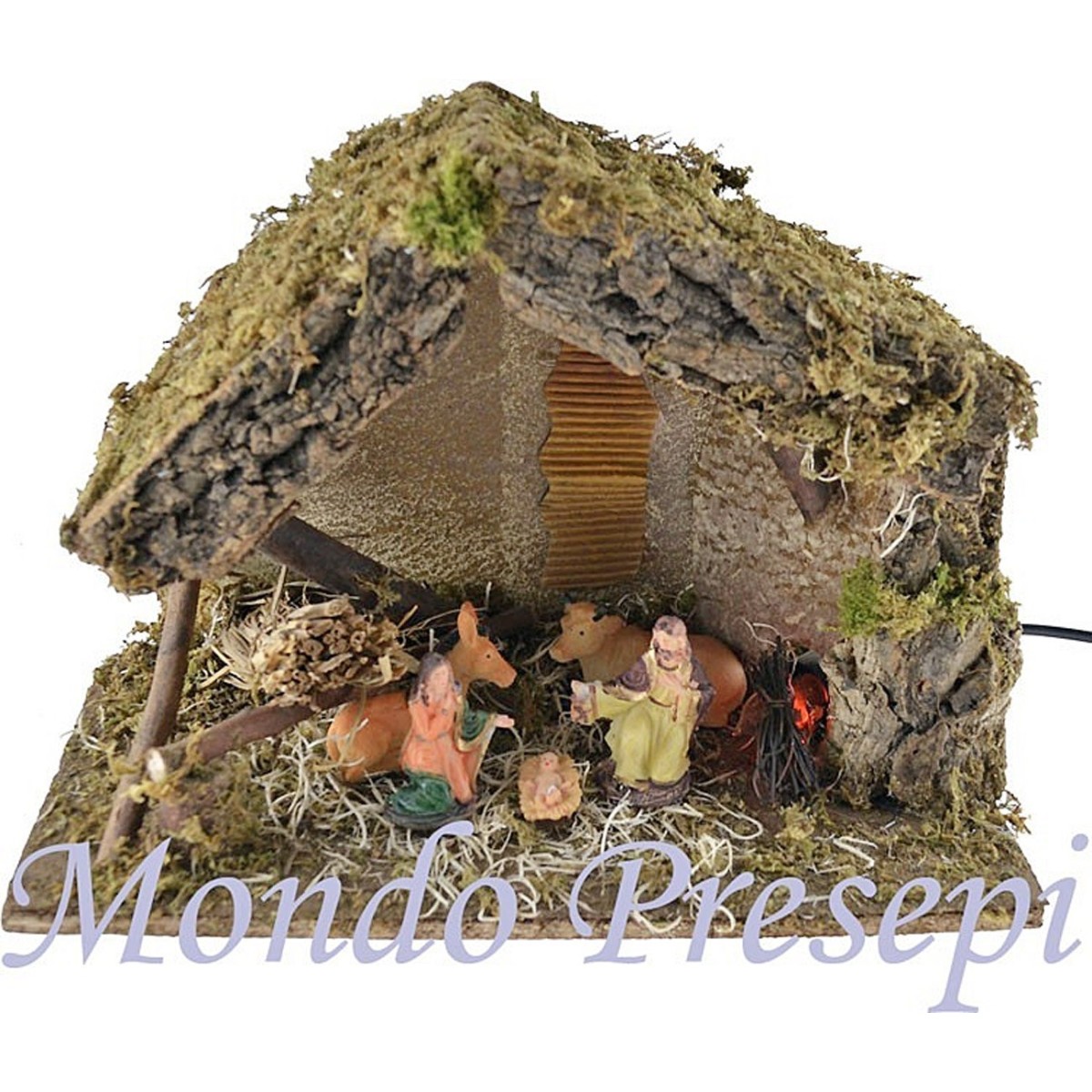 Cabaña de madera, corcho y musgo con natividad de resina de 9 cm, fuego funcionando con corriente,