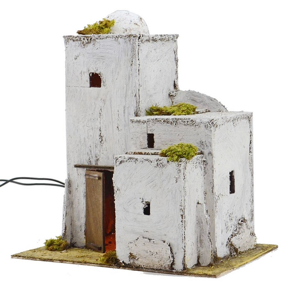 Casa árabe de 3 bloques con entrada a la izquierda y pequeñas ventanas en las tres estructuras, equipada con luz cálida interna que funciona con corriente. Esta ambientación ha sido creada por artesanos italianos para el Pesebre palestino de madera, recomendada para estatuas de altura 8 cm.