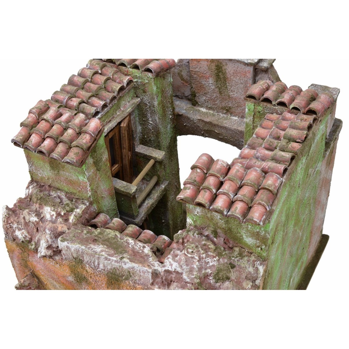 Gran palacio para belén con claustro al que se accede pasando por debajo de un majestuoso arco que presenta una decoración en varios niveles sobre el arquitrabe con un medallón central. Al adentrarse, se puede notar que las paredes de los palacios, meticulosamente acabadas con balconcillos, estrechan ligeramente el espacio interno para enfatizar más el sentido de profundidad que, con el doble arco y la escalera final, parece dirigirse hacia el infinito de su Belén. Producto realizado por hábiles artesanos italianos en poliestireno y madera para el Belén, recomendado para estatuas de altura de 10 cm.