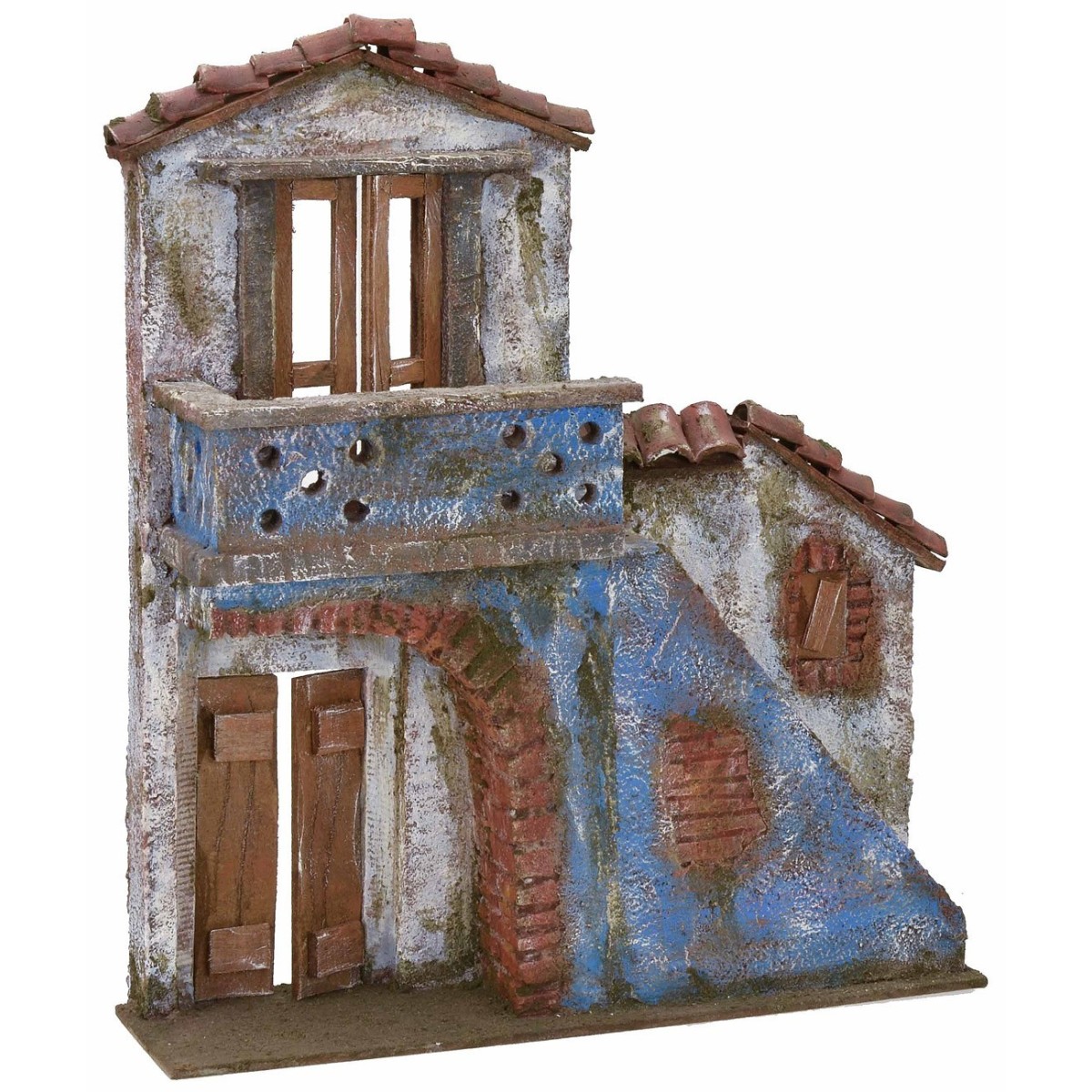 Fachada de casa para belén en estilo clásico popular: en la planta baja se encuentra la puerta de entrada semiabierta de doble hoja y a la derecha una escalera que conduce al piso superior donde encontramos una puerta ventana con balcón donde es posible colocar estatuas de altura 12 cm. El techo está compuesto por tejas de terracota. Artículo artesanal realizado en poliestireno, madera y terracota; recomendado para estatuas de 12 cm.