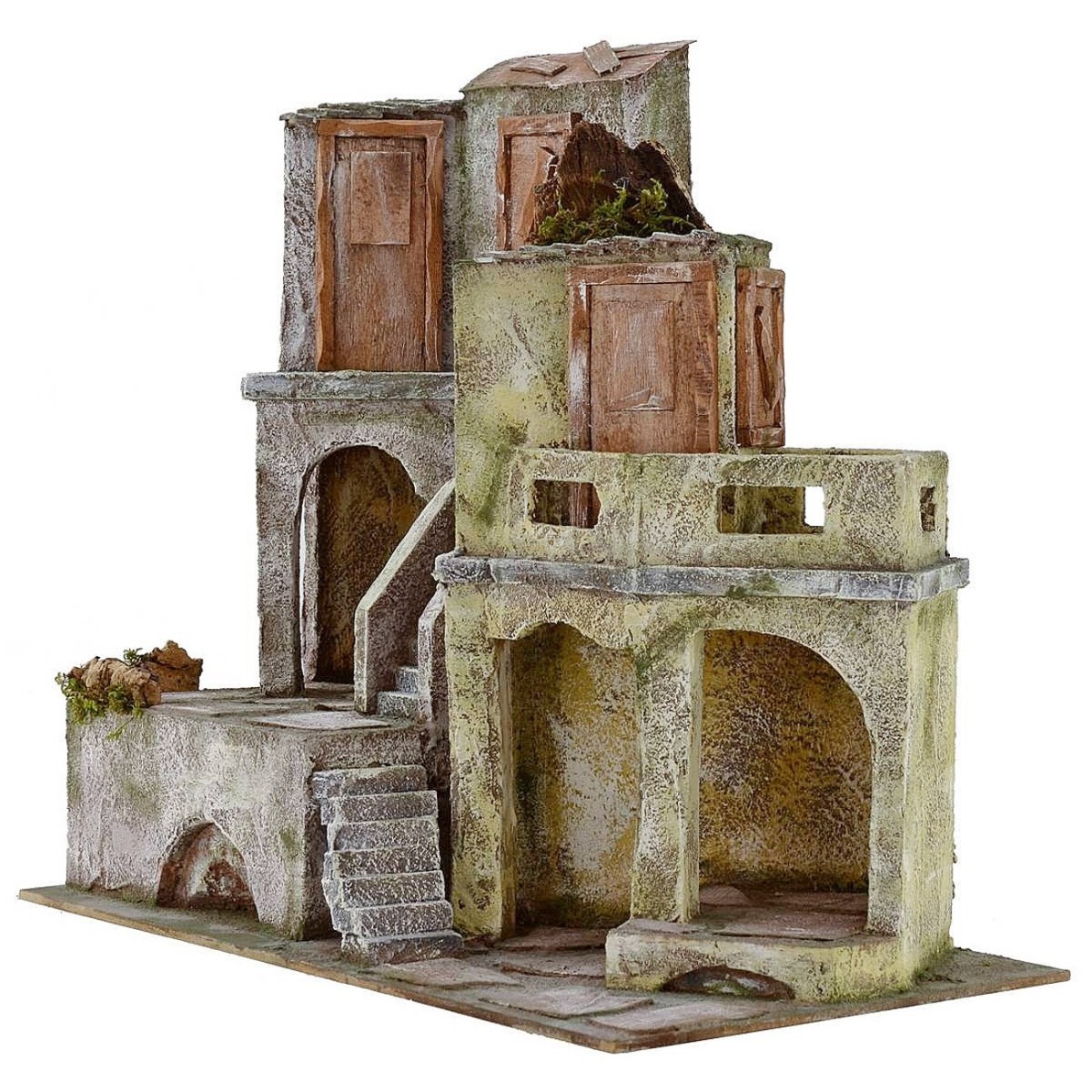 Pueblo con casas de dimensiones 40x22x37 para la escenografía del Belén. La escenografía está bien acabada: a la izquierda, subiendo unos escalones, encontramos un patio que termina en un pórtico caracterizado por dos entradas con arcos y columna. Continuando por las escaleras, llegamos a la vivienda a la cual se accede a través de la puerta de madera cerrada. En la pared de la casa hay una ventana cerrada de madera. A la derecha, en cambio, se puede notar, en la planta baja, un patio que también termina en el pórtico delineado por dos entradas con arcos y columna, y, en la primera planta, una casa con balcón. La segunda casa también posee una puerta de madera cerrada donde es posible colocar estatuas de altura 10 cm. Artículo artesanal realizado en poliestireno, madera y corcho; recomendado para estatuas de 10 cm. Dado que la escenografía está hecha completamente a mano, los colores pueden variar ligeramente respecto a la foto.