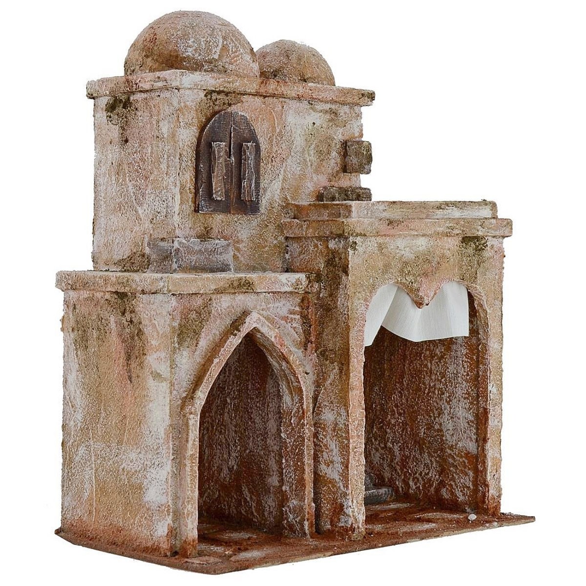 Elegante estructura palestina. Como se puede notar, a la izquierda, hay un espacio con una entrada en arco, ideal para la realización de una tienda. A la izquierda, en cambio, hay un espacio en el cual se puede ver un altar donde se imagina posible la realización de un templo. En el piso superior, vemos una porción de casa, donde hay una ventana con hoja de arco de madera cerrada. El techo es plano a la derecha y está caracterizado por dos cúpulas emergentes a la izquierda. Este escenario ha sido creado enteramente en Italia por manos artesanas expertas utilizando poliestireno y madera, que simula el efecto piedra. Recomendado para estatuas de 10 h cm.