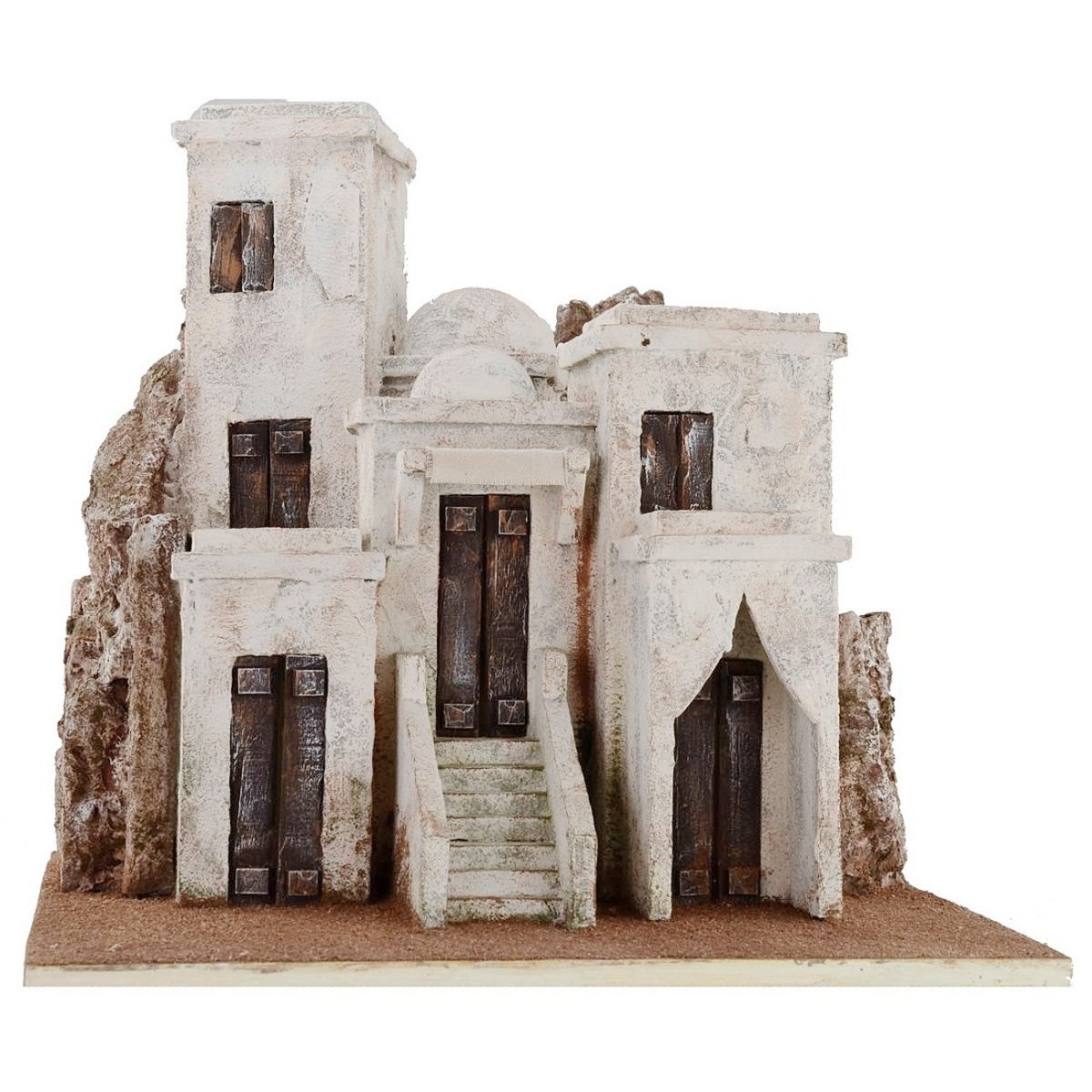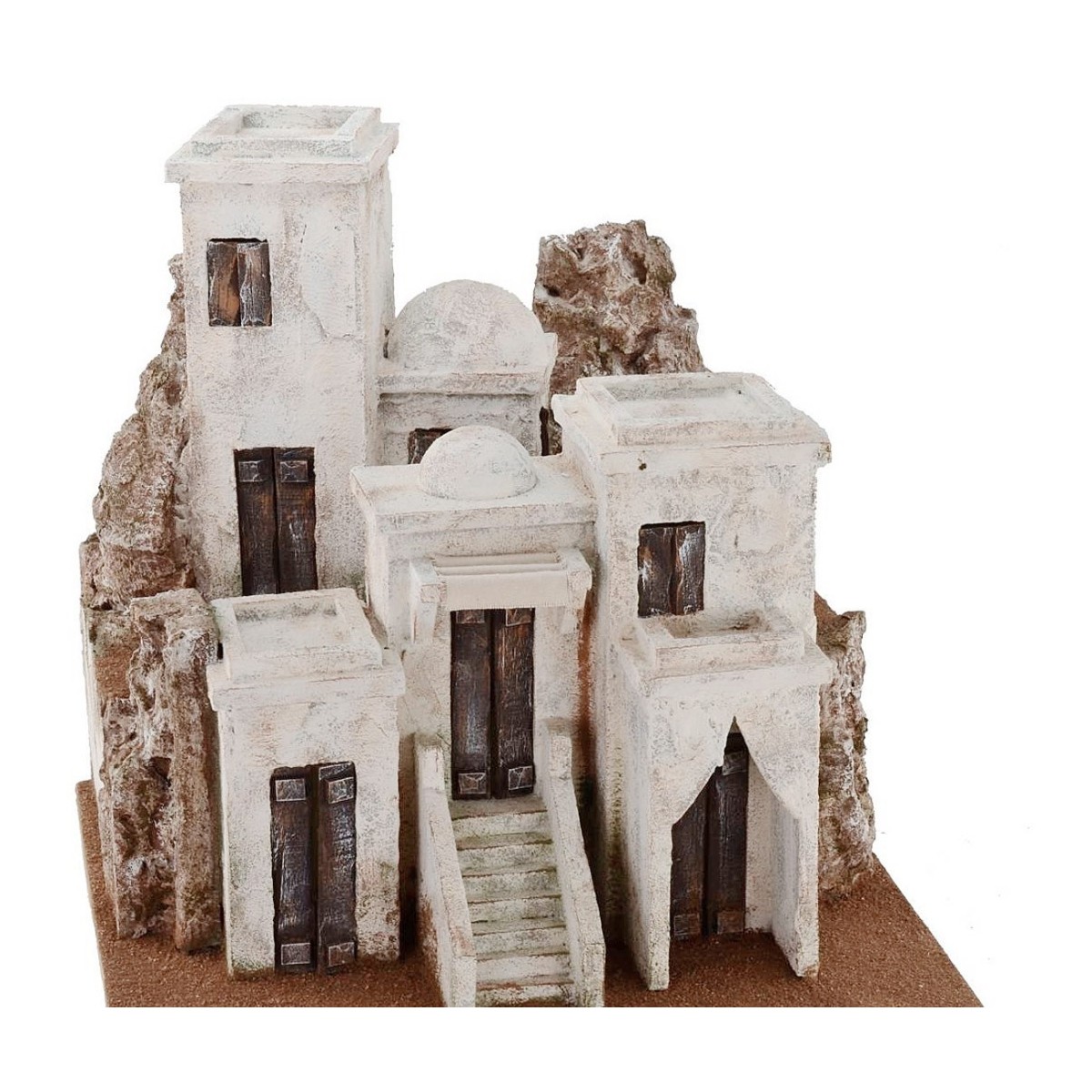 Pueblo árabe con casas para el escenario del Pesebre. La escenografía está bien acabada en los detalles. Es posible colocar estatuas de una altura recomendada de 10 cm a su gusto en la composición. Artículo realizado íntegramente en Italia por manos artesanas expertas, utilizando poliestireno, madera y corcho.