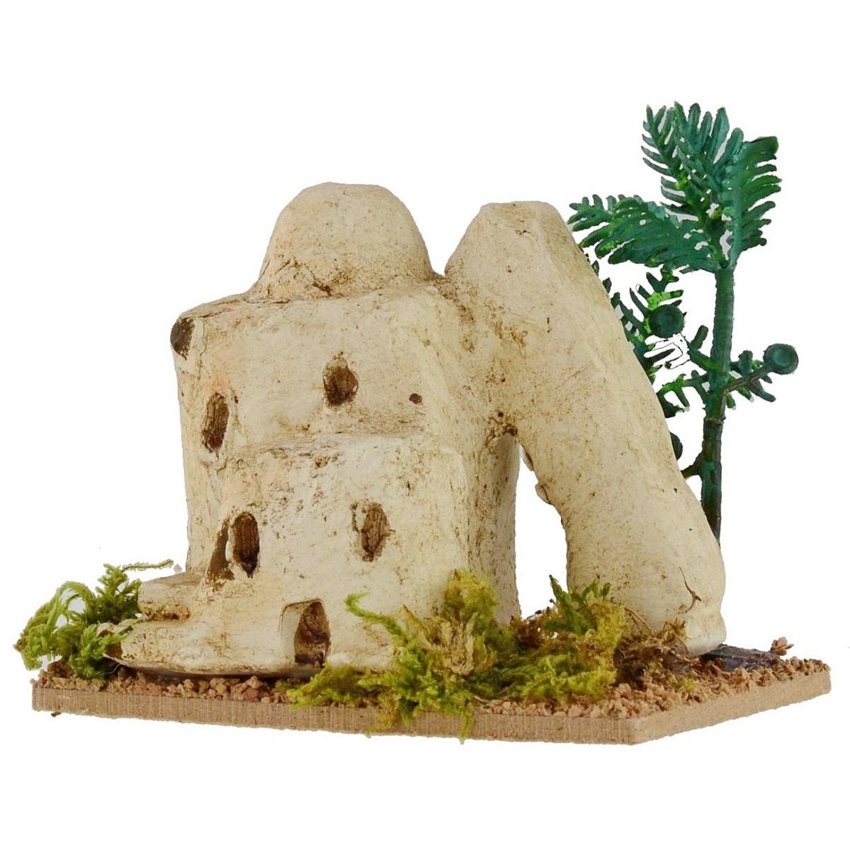 Casa palestina con columna inclinada. La escenografía está bien acabada: la vivienda posee la clásica estructura árabe con cúpula en el techo. Está creada artesanalmente en yeso cerámico. Además, hay una palmera doble. El uso del musgo hace que el paisaje sea muy sugestivo y natural. El producto es ideal para completar el Belén árabe con paisajes orientales en la distancia, jugando con la perspectiva. Producto realizado íntegramente en Italia por manos artesanas expertas utilizando yeso cerámico, madera, corcho y musgo.