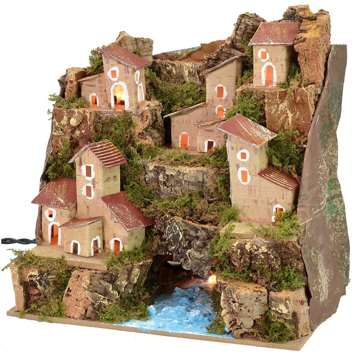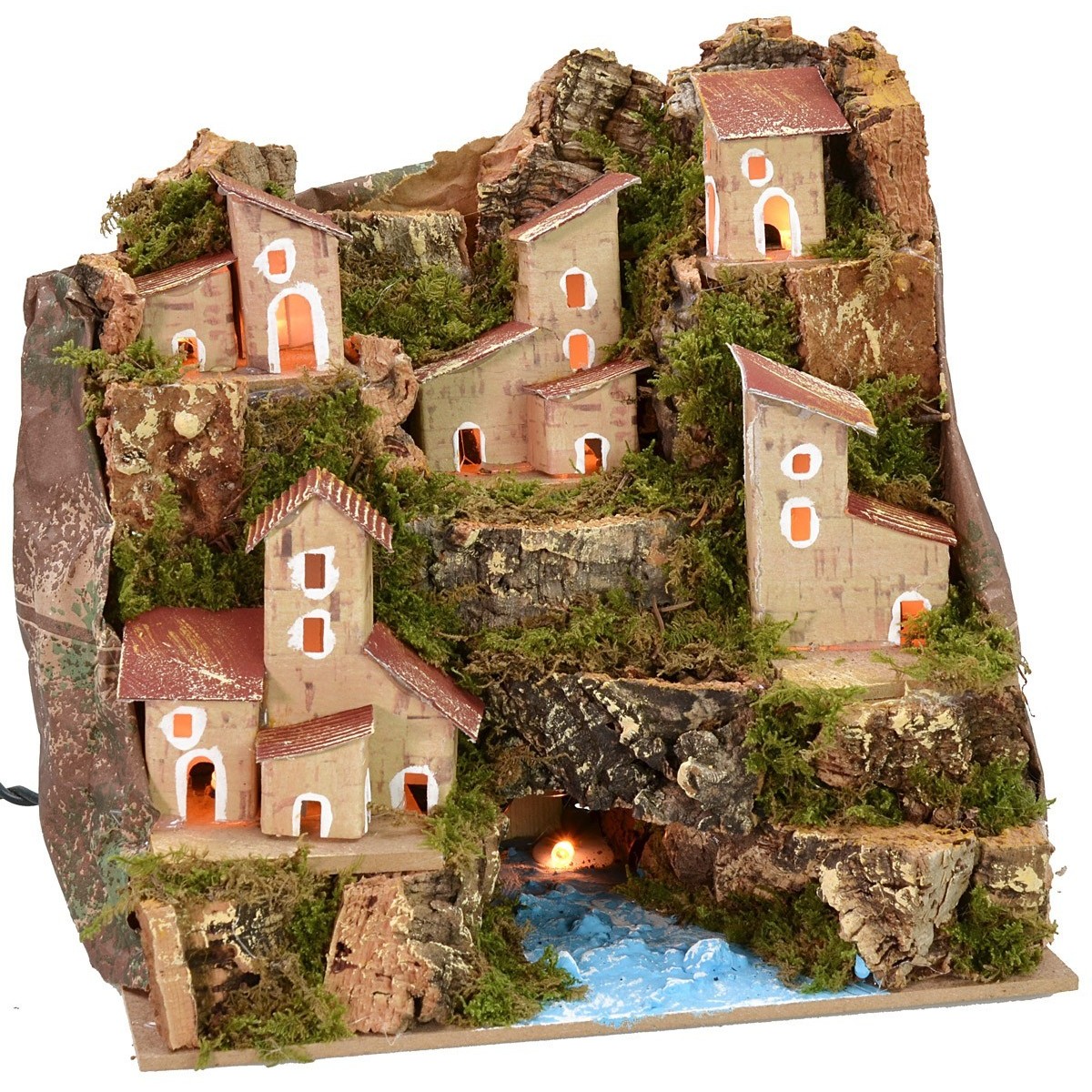 Paisaje para Belén artesanal iluminado de estilo clásico napolitano, caracterizado por la presencia de un río central, pintado a mano, que fluye bajo un pueblo visible en la distancia. Las luces, que funcionan con corriente, iluminan el paisaje y crean una atmósfera sugestiva. Además, el uso del musgo y la corteza hace que el paisaje sea muy realista, ya que está lleno de vegetación verde y paredes rocosas circundantes. Artículo realizado íntegramente en Italia por manos artesanas expertas, utilizando corcho, madera y musgo. Ideal para enriquecer tu Belén con paisajes en la distancia.