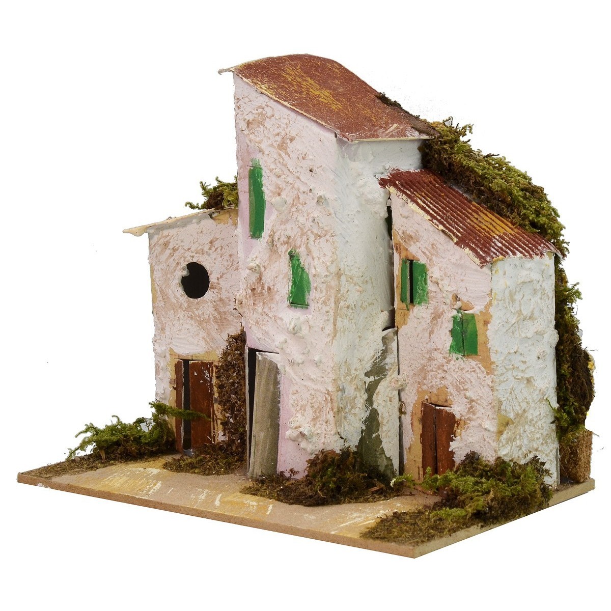 Viviendas a lo lejos con estilo clásico napolitano, ideales para crear y enriquecer paisajes de tu propio Belén, utilizando también otros productos de la misma línea, según tus gustos y preferencias. El uso del musgo hace que el paisaje sea muy realista, ya que está lleno de vegetación verde. Artículo realizado íntegramente en Italia por manos artesanas expertas, utilizando corcho, madera y musgo.