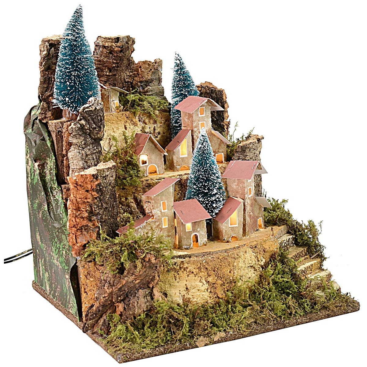 Paisaje montañoso para belén con tres terrazas y aldeas. La iluminación de las casitas crea una atmósfera muy sugestiva y el artículo es ideal para crear el efecto de profundidad en el belén. Artículo que funciona con corriente y está hecho en Italia con madera, corcho y musgo.