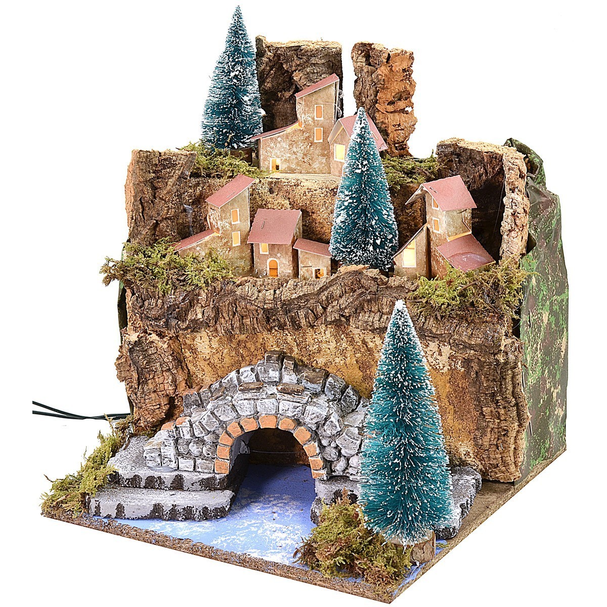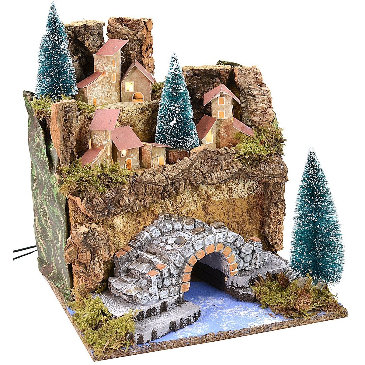 Paisaje con casitas en la distancia situadas en dos terrazas mientras que en primer plano hay un puente debajo del cual pasa un río. En todo el entorno hay árboles y una rica vegetación. Gracias a las luces incluidas en el artículo es posible iluminar la escena a través de corriente. El artículo ha sido producido con madera, corcho y musgo.