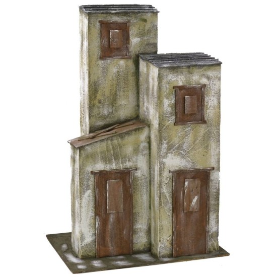 Casa para pesebre en estilo clásico Popular dispuesta en varios niveles, en la planta baja se encuentran dos portones de entrada de madera. Artículo artesanal realizado en poliestireno y madera, recomendado para estatuas de 30 cm.