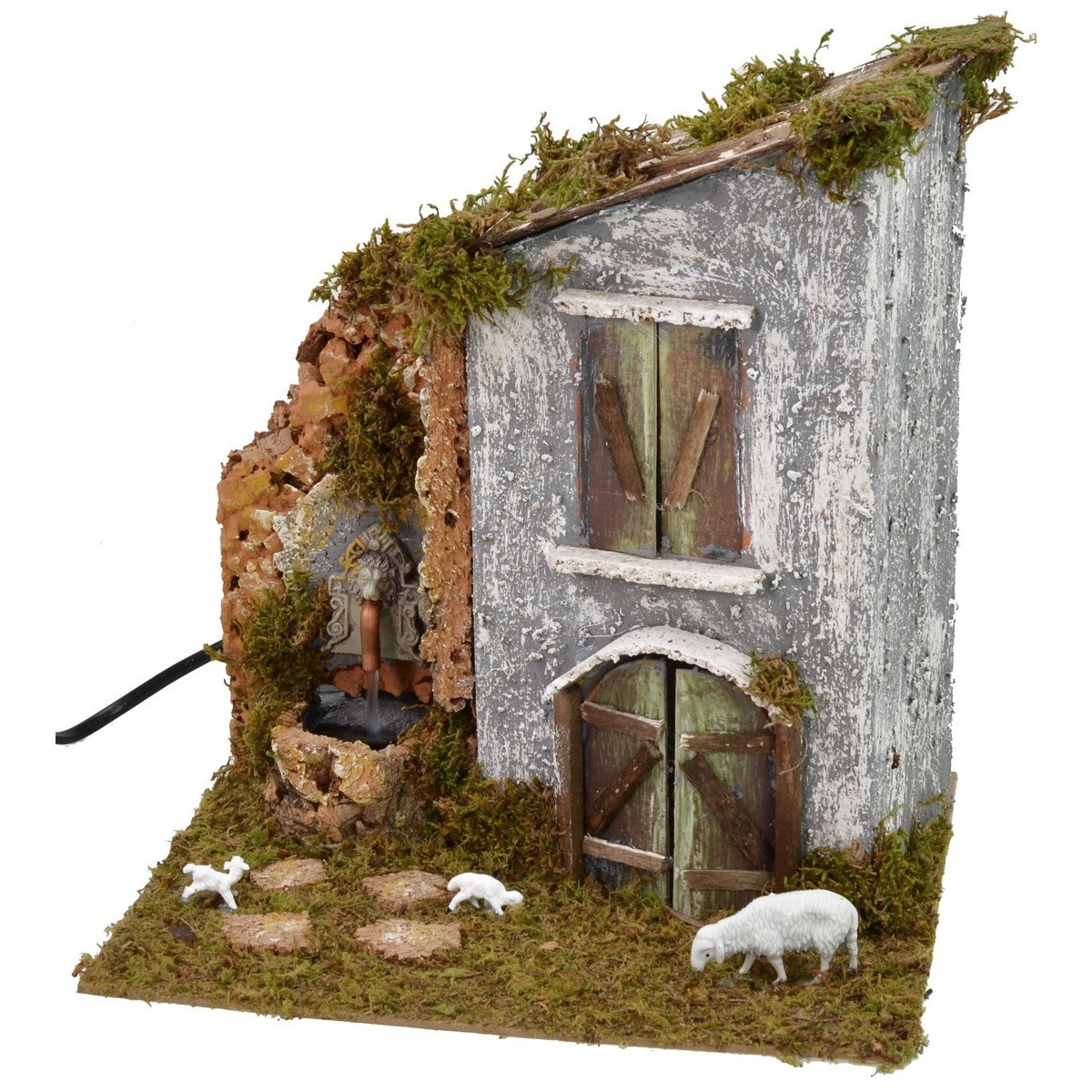 Casita de campo con fuente funcional a corriente completa con bomba para el reciclaje de agua, adecuada para estatuas de altura 8-10 cm. La escenografía resulta muy realista gracias a la rica presencia de detalles, la fachada del caserío está enriquecida con una puerta de arco de doble hoja y una ventana, el orificio de salida del agua de la fuente coincide con la boca del león decorativo. En el prado circundante pastan una oveja y dos corderos. El producto está realizado artesanalmente en Italia utilizando madera, corcho y musgo.