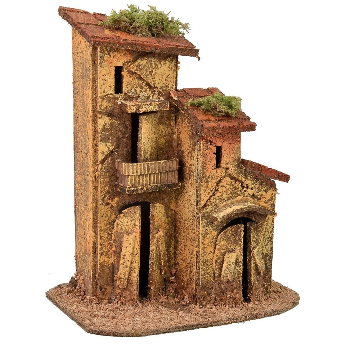 Conjunto de dos viviendas caracterizadas por puertas de entrada de doble hoja semiabiertas y balcones en los pisos superiores. El artículo está realizado artesanalmente por manos expertas utilizando madera y corcho y pintándolos a mano. Se recomienda combinar el producto con estatuas de altura 5-6 h cm.