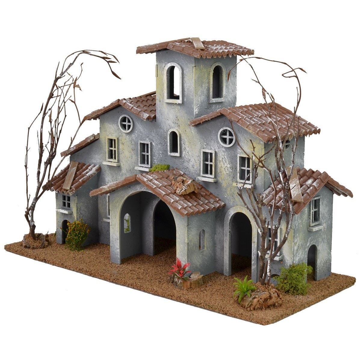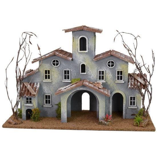 Aldea del siglo XVIII de color pastel con el patio delantero. En la fachada del edificio hay numerosas ventanas tanto redondas como rectangulares. A los lados se encuentran dos árboles sin hojas y sin la vegetación decorativa. El escenario se puede completar con la Natividad Landi de 6-6,5 cm disponible en los productos relacionados. Los materiales de producción del objeto son madera, corcho y musgo.