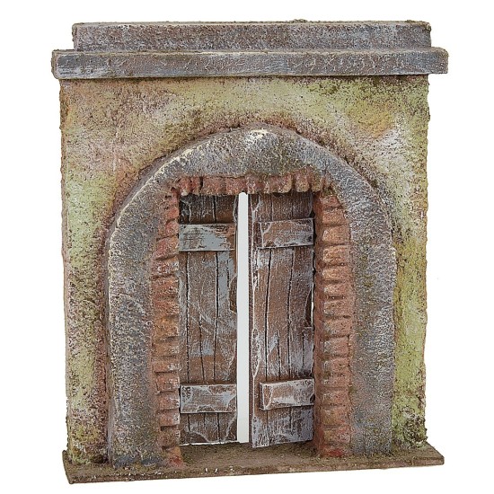 Fachada de casa para belén en estilo clásico popular, caracterizada por una pared rectangular inspirada en la forma del portón de dos hojas rodeado de ladrillos y un relieve de piedra en forma de arco. Artículo adecuado para estatuas de altura de 8-10 cm y realizado artesanalmente en Italia con poliestireno, madera y terracota.