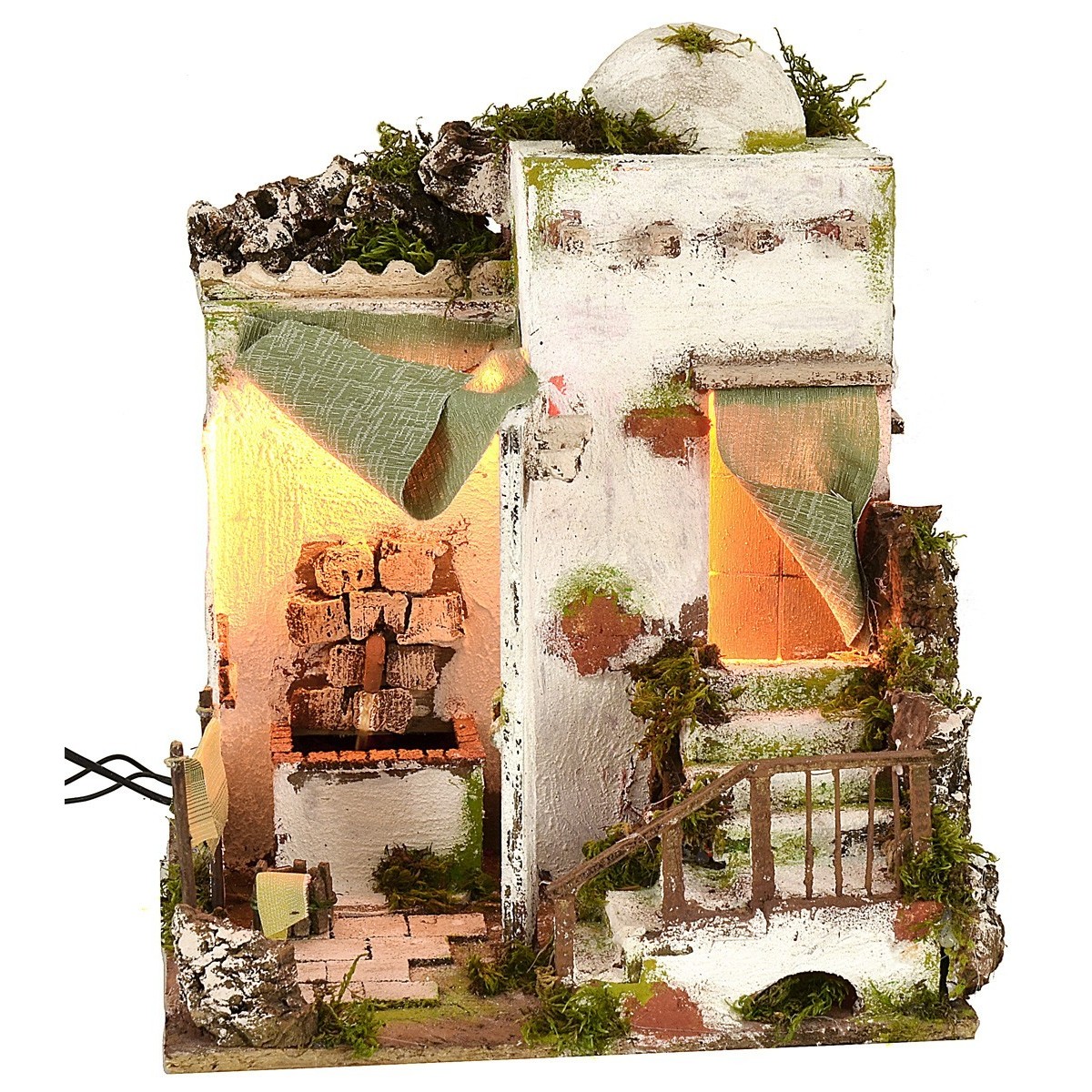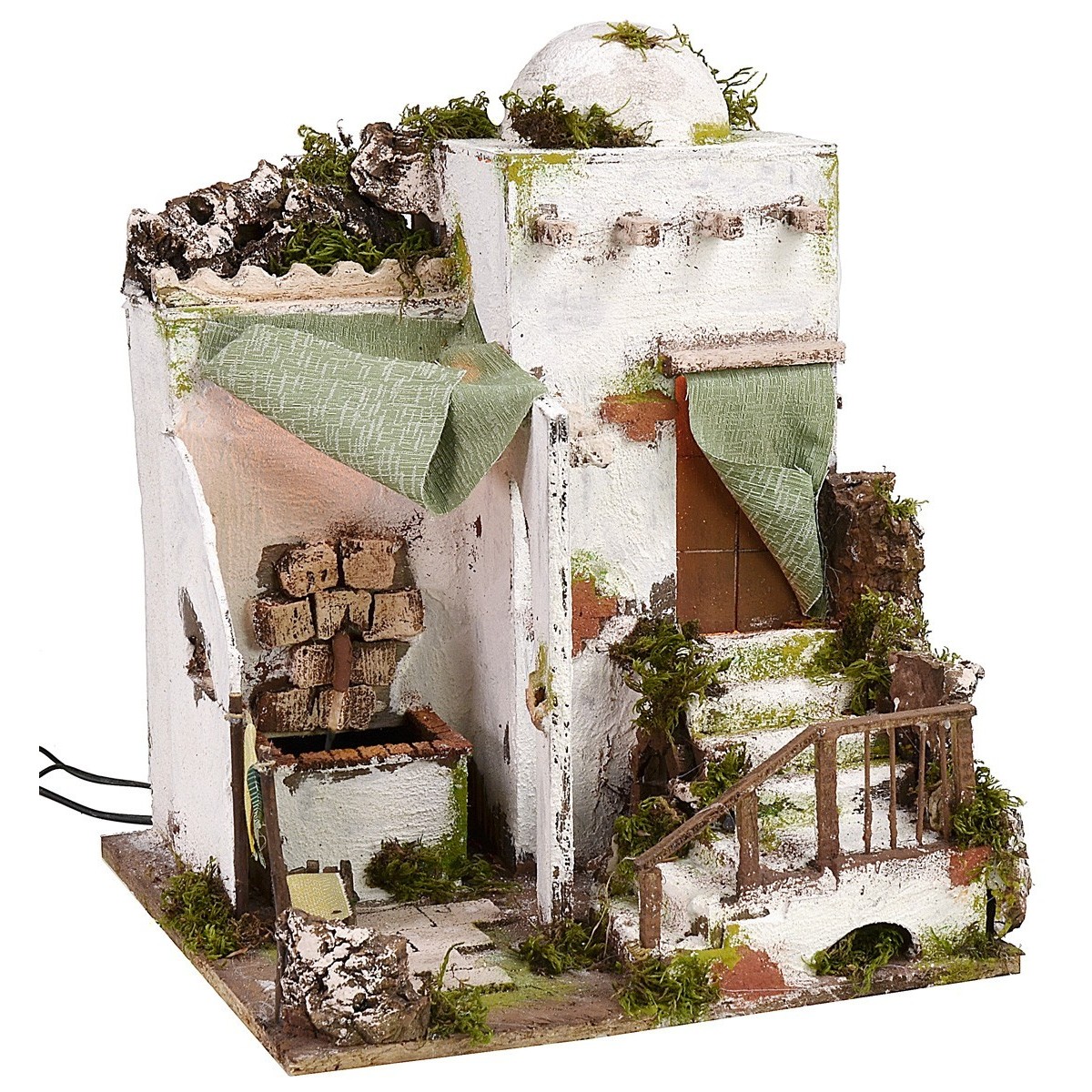 Casa palestina iluminada a la que se accede a través de una gran escalera que lleva a una entrada cubierta con una cortina verde, el techo plano está caracterizado por una cúpula y algunos adornos. Los dos lados de la vivienda están divididos por una alta pared con arco que sostiene a la izquierda una tienda bajo la cual se encuentra una fuente que funciona con corriente y ya está equipada con una bomba. La ambientación está acabada con el más mínimo detalle, desde el pavimento, hasta las piedras y el tendedero con la ropa al lado. El artículo es recomendado para estatuas de altura de 10-12 cm y ha sido producido en Italia por hábiles manos artesanas con madera, corcho y musgo.