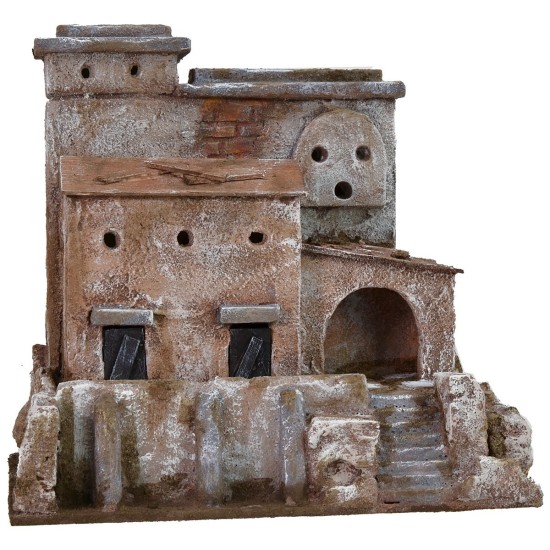 Casa de campo que se alza sobre una meseta elevada a la que se accede a través de la escalera a la derecha, cuenta con un establo abierto por un gran arco y al lado la vivienda de varios pisos caracterizada por pequeñas ventanas circulares. El producto ha sido realizado en Italia por manos artesanas expertas con madera y poliestireno, dadas las dimensiones se recomienda un uso a distancia para enfatizar el efecto de perspectiva en el belén.