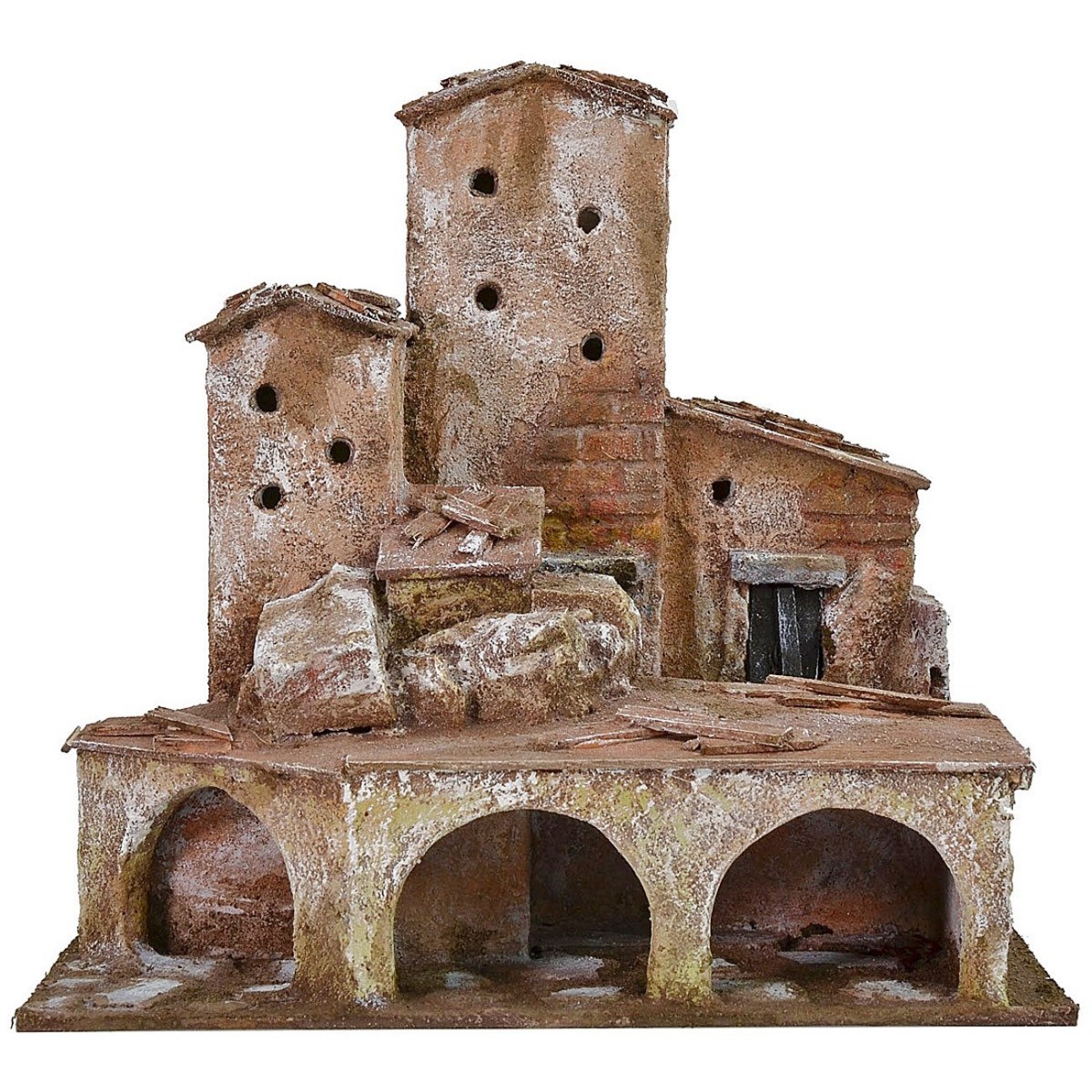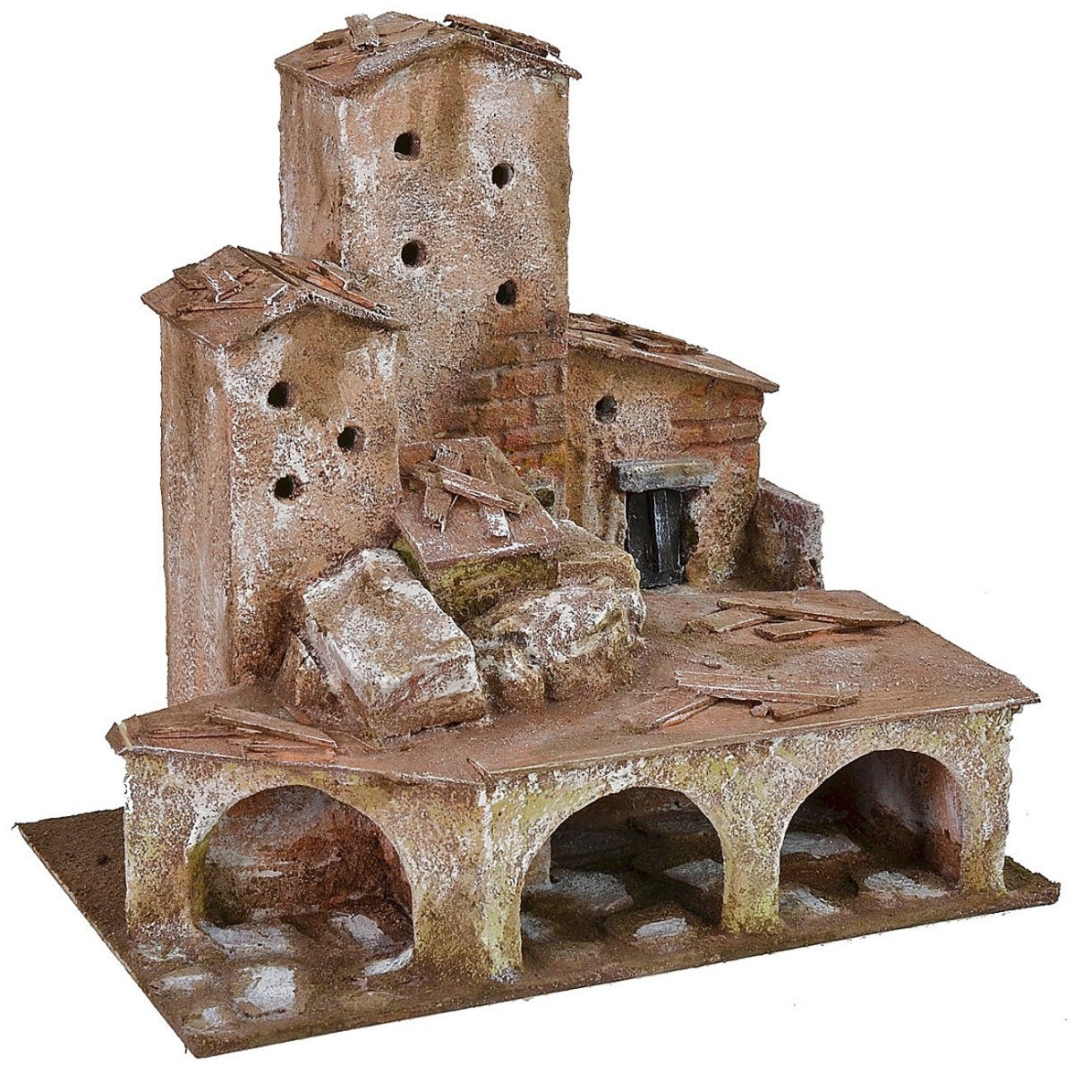 Casa de campo de varios pisos con un gran pórtico con arcos y caracterizada por pequeñas ventanas circulares. El producto ha sido realizado en Italia por manos artesanas expertas con madera y poliestireno. Dadas las dimensiones, se recomienda su uso a distancia para enfatizar el efecto de perspectiva en el belén.