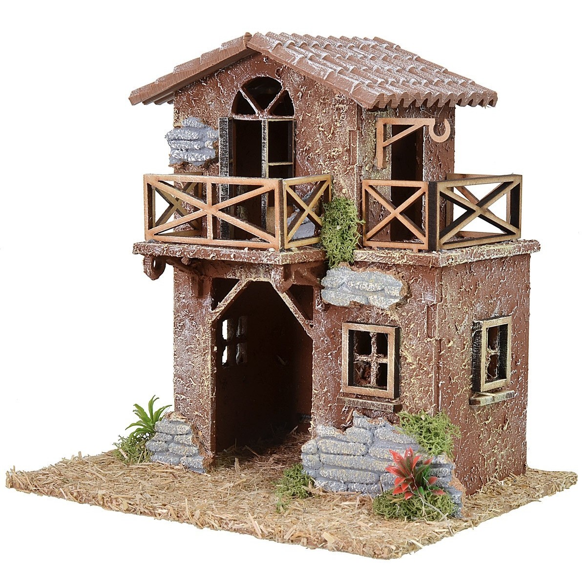 Casa de campo de dos pisos con terrazas, la estructura está equipada con un enganche en la parte superior del lado derecho que podría completarse con una cuerda de polea, o se podría colgar una campana o una linterna. La amplia entrada podría decorarse con detalles para montar, por ejemplo, una tienda artesanal. El artículo ha sido producido en Italia con madera, corcho, musgo y yeso para estatuas de altura de 6-8 cm.