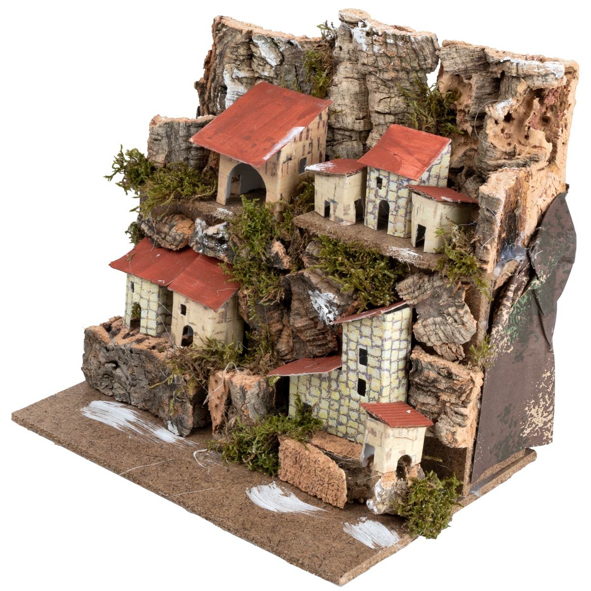 Paisaje montañoso con pueblo de casitas de dos niveles, ideal para crear escenarios de paisajes a lo lejos.