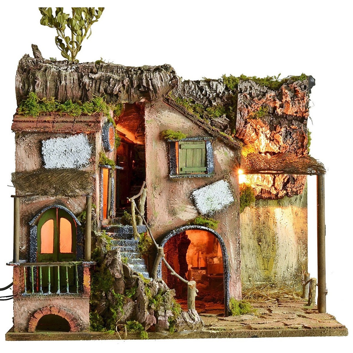 Borgo iluminado muy característico con casas de marcos verdes y una gran escalera en el centro que conduce al piso superior. A la izquierda un balconcito, a la izquierda un gran arco con espejo efecto profundidad donde se ven una fuente y una farola reflejados. Al lado una gran pérgola de madera donde se puede colocar, por ejemplo, el Nacimiento. Este artículo es recomendado para estatuas de altura 10-12 cm y funciona con corriente.