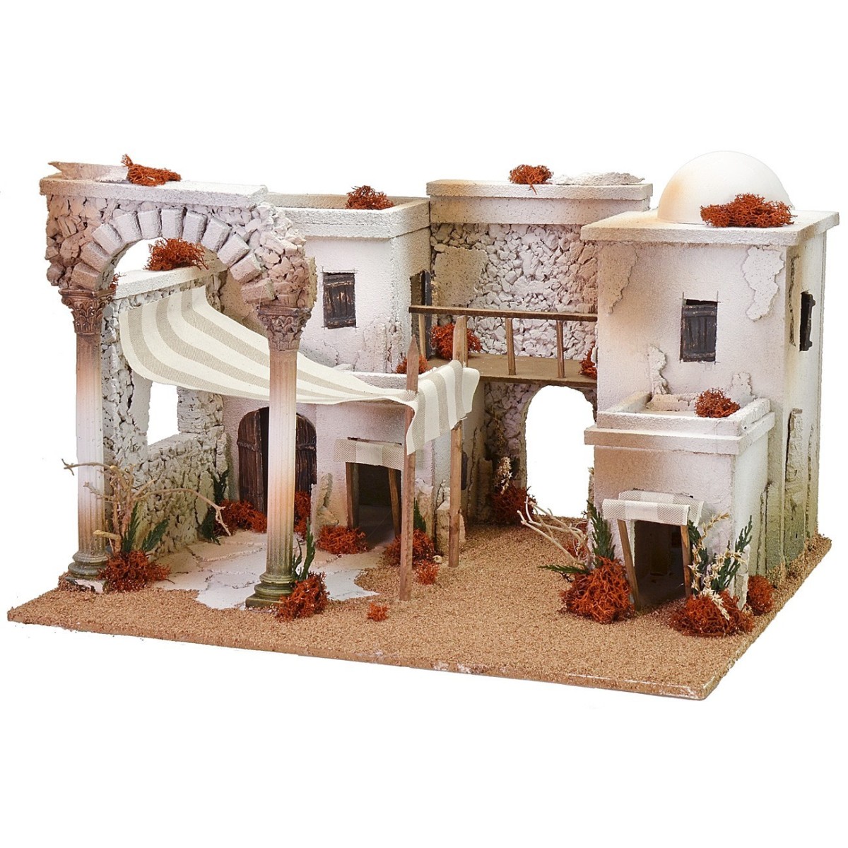 Pueblo palestino constituido por dos grandes viviendas conectadas entre sí por un balcón de madera central, las casas son blancas con los clásicos techos planos y cúpulas. La estructura está bien acabada con paredes de corcho que imitan el efecto de la piedra y la escena resulta colorida gracias a los líquenes y la vegetación. En primer plano a la izquierda, un gran arco con una amplia carpa donde se puede, por ejemplo, colocar el Nacimiento dada también la presencia de la paja. El artículo ha sido producido por artesanos italianos con madera y corcho y se recomienda para estatuas de altura de 10 cm. La escena puede ser iluminada con luces que encontrarán en los productos relacionados debajo de la tabla.