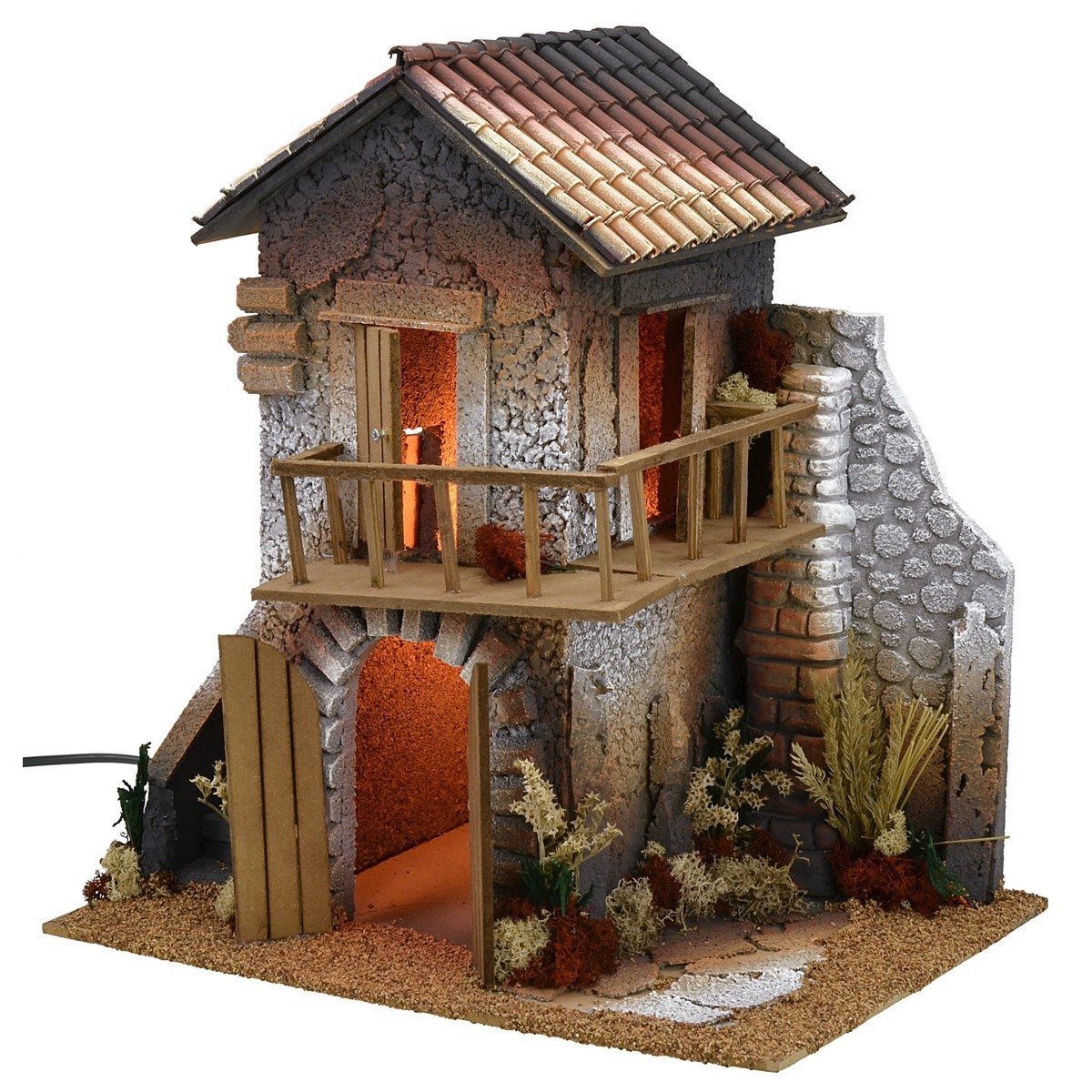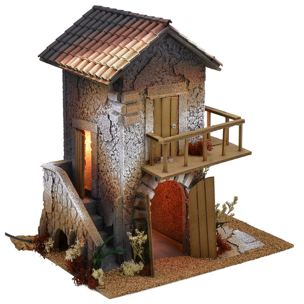 Casa iluminada para Pesebre con escalera que conduce a la entrada del piso superior, caracterizado por un amplio balcón que recorre dos lados de la construcción. En la planta baja, un gran arco que conduce a un espacio donde se puede montar una tienda artesanal. La vivienda está minuciosamente terminada en los detalles como, por ejemplo, la iluminación, los decorados de las paredes y la vegetación. Este artículo para pesebre funciona con corriente eléctrica y se recomienda para estatuas de altura de 10-12 cm. El producto ha sido realizado artesanalmente en Italia con madera, corcho y liquen.