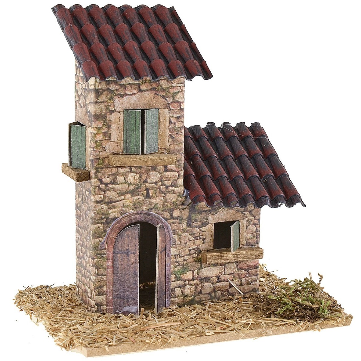 Casa para belén con muro efecto piedra y dos techos inclinados, la estructura está compuesta por dos edificios de diferentes alturas y se caracteriza por tener ventanas verdes y una puerta de doble hoja. El artículo es adecuado para figuras de belén de altura 3,5-4-5 cm y ha sido producido artesanalmente en Italia con materiales naturales.