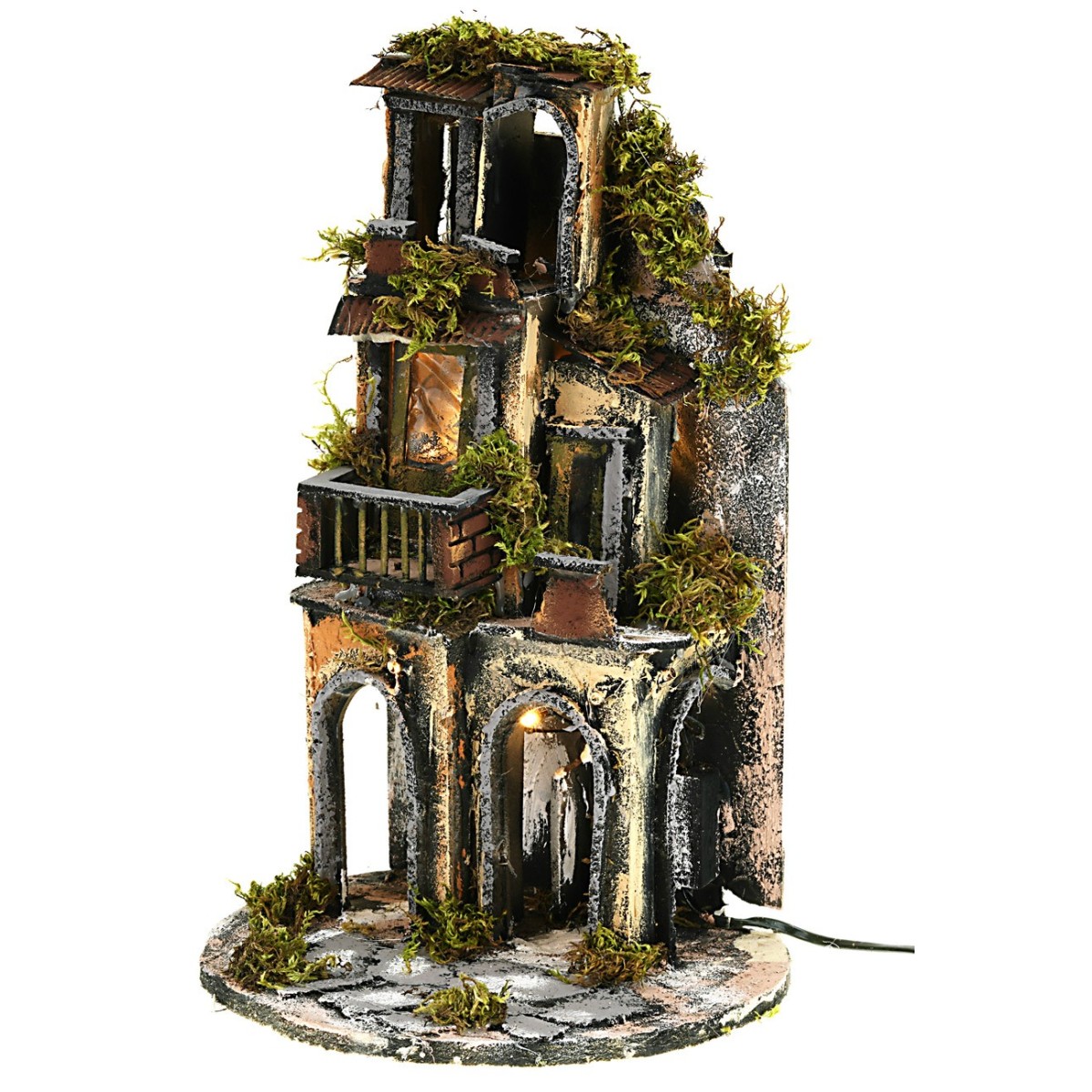 Pueblo iluminado para pesebre en estilo napolitano compuesto por varias casas en varios niveles con paredes estucadas. En el piso inferior hay algunos accesos abiertos, mientras que en el superior hay un balcón. Este edificio está iluminado con luces que funcionan con baterías ya incluidas (2xCR2032) y se recomienda para estatuas de altura 7-8 cm; en los detalles del producto están disponibles todas las informaciones relativas a las estatuas que se pueden combinar. El artículo ha sido producido artesanalmente en Italia con madera, corcho y musgo.