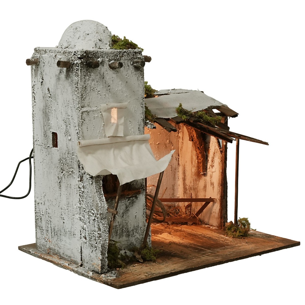Vivienda iluminada caracterizada por muros blancos al estilo palestino con una pérgola de madera cubierta por una tienda que puede albergar la Natividad, estando también decorada con heno. El producto funciona con corriente y ha sido realizado artesanalmente en Italia con madera, corcho y musgo. Se recomienda el uso de estatuas de 10 cm de altura y toda la información relativa a las estatuas que se pueden combinar está disponible en los detalles del producto.
