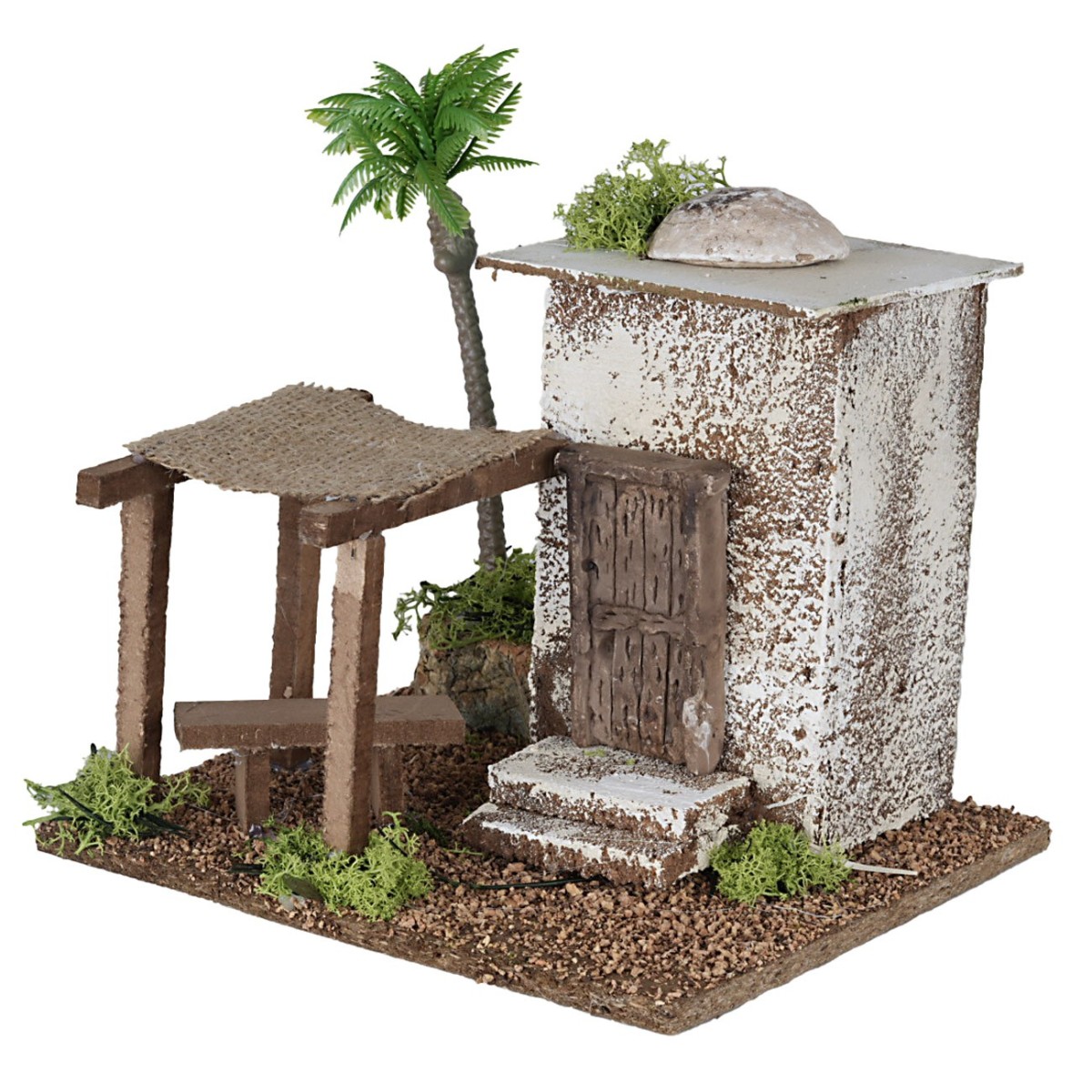 Casa palestina con una carpa sobre una mesa en el exterior. El producto ha sido realizado por hábiles artesanos italianos en madera, liquen y otros materiales, para el Pesebre palestino. El artículo se recomienda para estatuas de 8-10 cm de altura.