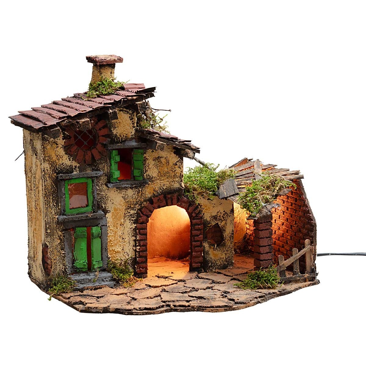 Casa de dos pisos con al lado, a la derecha, un pequeño establo iluminado por una luz cálida con un cercado cerca de su entrada. El producto está hecho artesanalmente en Italia en madera, corcho y musgo y funciona con corriente.