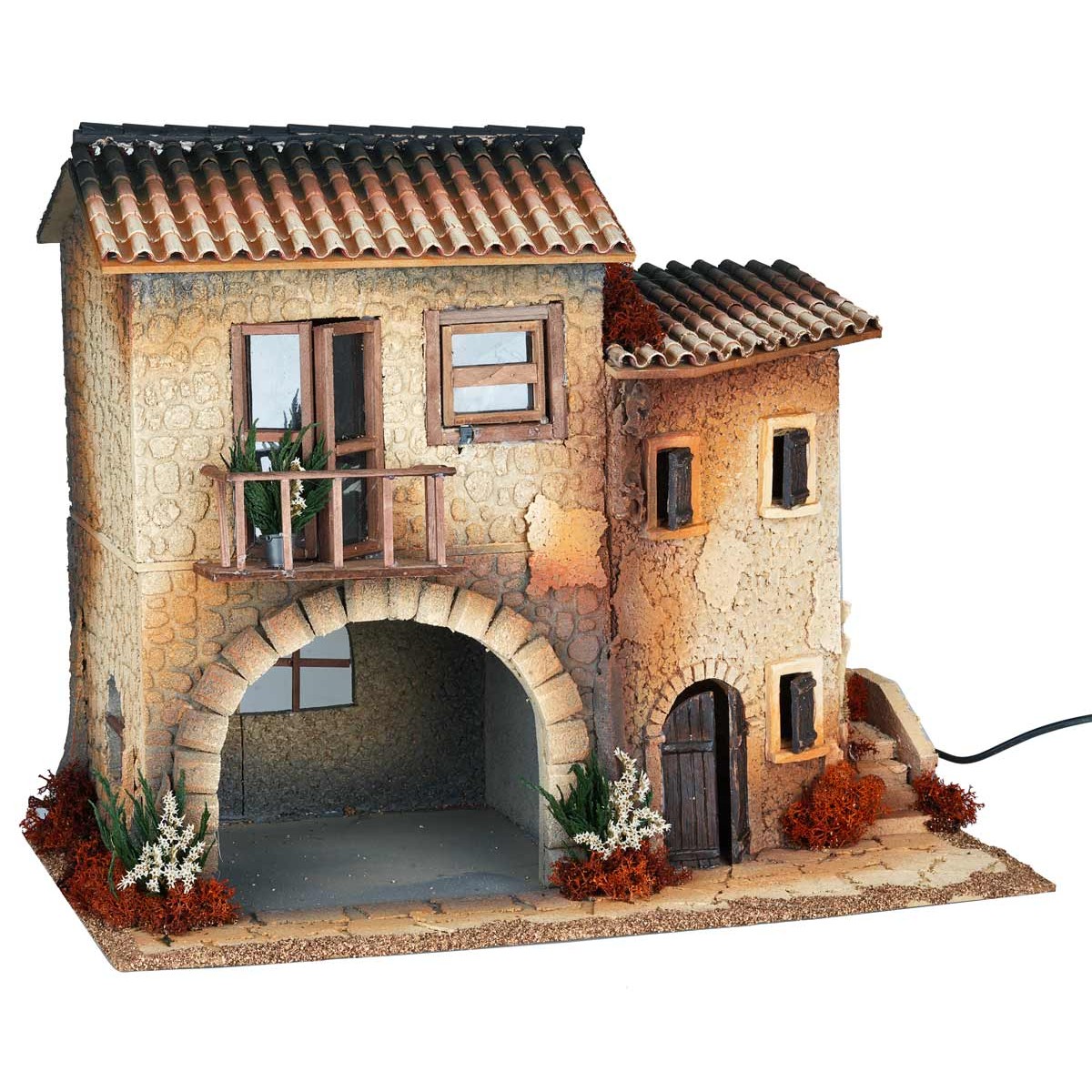 Pueblo iluminado en estilo clásico napolitano, caracterizado por una mujer en movimiento de 12 cm en el piso superior que abre y cierra la ventana, todo funcionando con corriente eléctrica.
