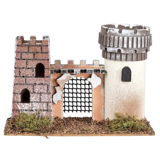 El castillo presenta una estructura compacta compuesta por dos torres conectadas por un arco central dotado de un portón semicerrado. La torre de la izquierda es rectangular y presenta aperturas en forma de arco, mientras que la de la derecha es circular, coronada por un almenado decorativo. Ambas torres están unidas por una pared almenada, enriquecida con detalles de yeso deteriorado y vegetación en la base.