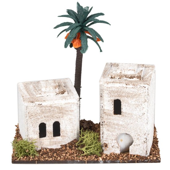 Casita árabe con dos edificios adyacentes y palma central, ideal para crear escenarios de paisajes en la distancia.