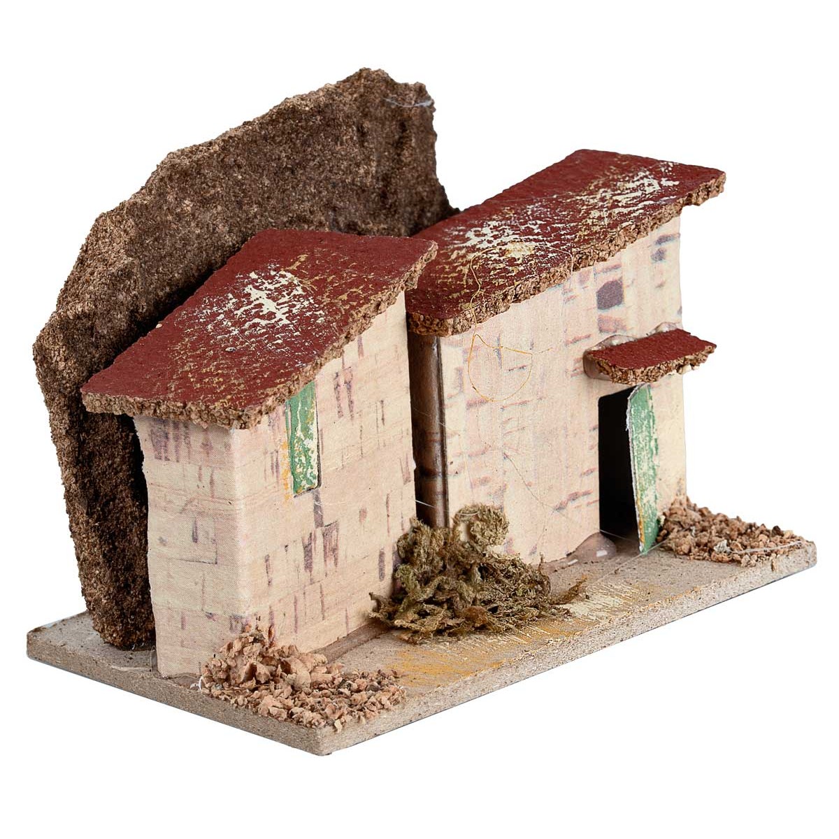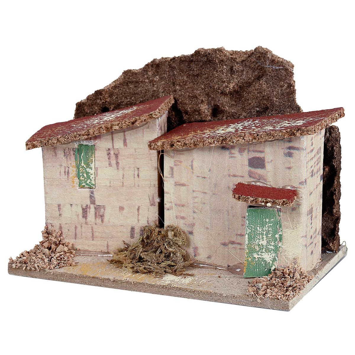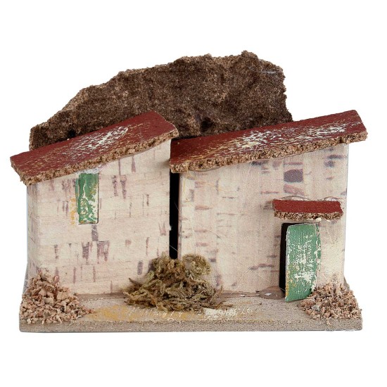 La escena presenta dos viviendas adosadas con techo inclinado de corteza, puertas y ventanas pintadas, enriquecidas con detalles de musgo y corcho en la base.