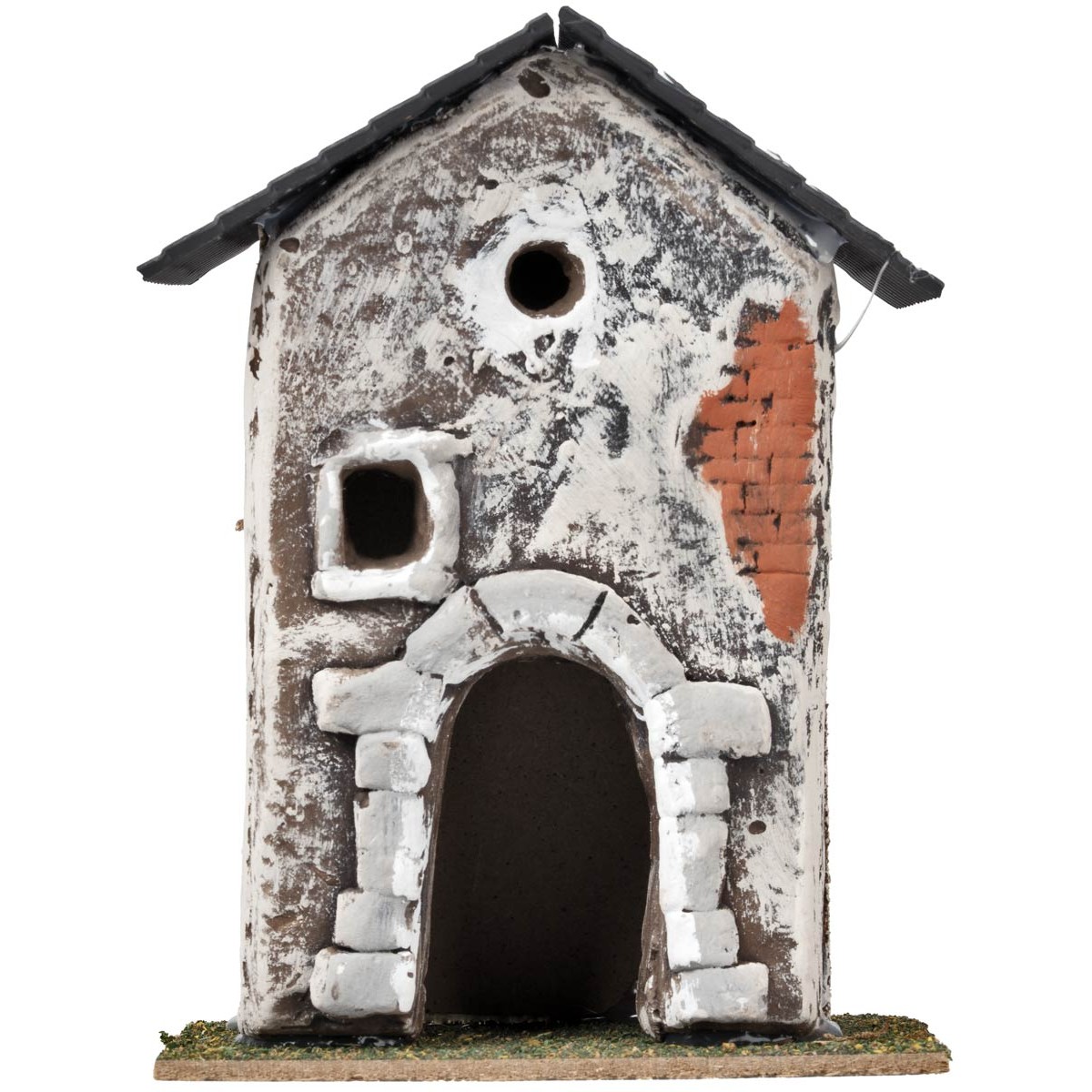 La estructura presenta una fachada con revoque desgastado, porciones de ladrillos a la vista y dos aperturas irregulares, una ventana cuadrada y una ventana redonda, que le aportan realismo a la escena.