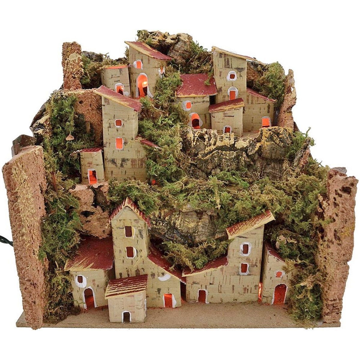 Paisaje para belén con casas iluminadas por luces LED de luz blanca cálida, funcionando con corriente. Ideal para crear ambientaciones de fondo y paisajes lejanos. Realizado artesanalmente en Italia con madera, corcho, musgo y otros materiales. Al tratarse de una composición artesanal, la disposición de las casas puede variar ligeramente respecto a la foto mostrada. Medidas: Ancho: 20 cm, Profundidad: 14 cm, Altura: 18 cm, Alimentación: 220 V. Materiales: Madera, corcho y musgo.