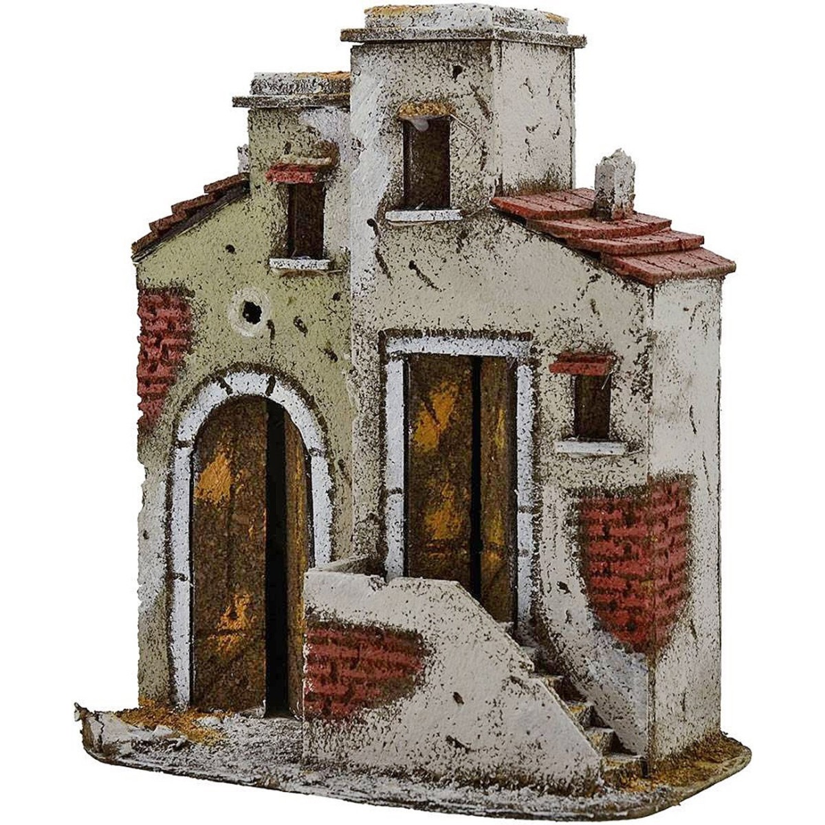 Casa artesanal para pesebre bien acabada realizada en corcho, recomendada para estatuas de altura 8-10 cm. Haciendo pequeños agujeros en la parte trasera de la casa es posible iluminarla con luces y los colores de la fachada pueden variar respecto a la foto.