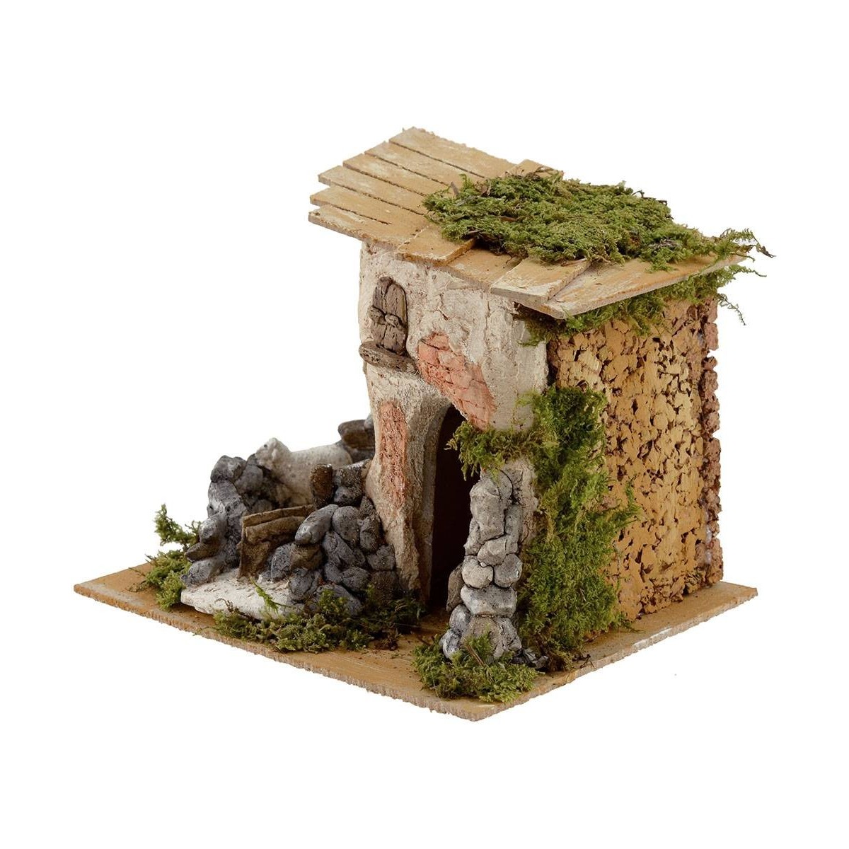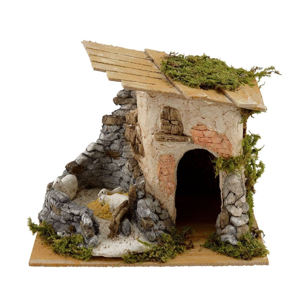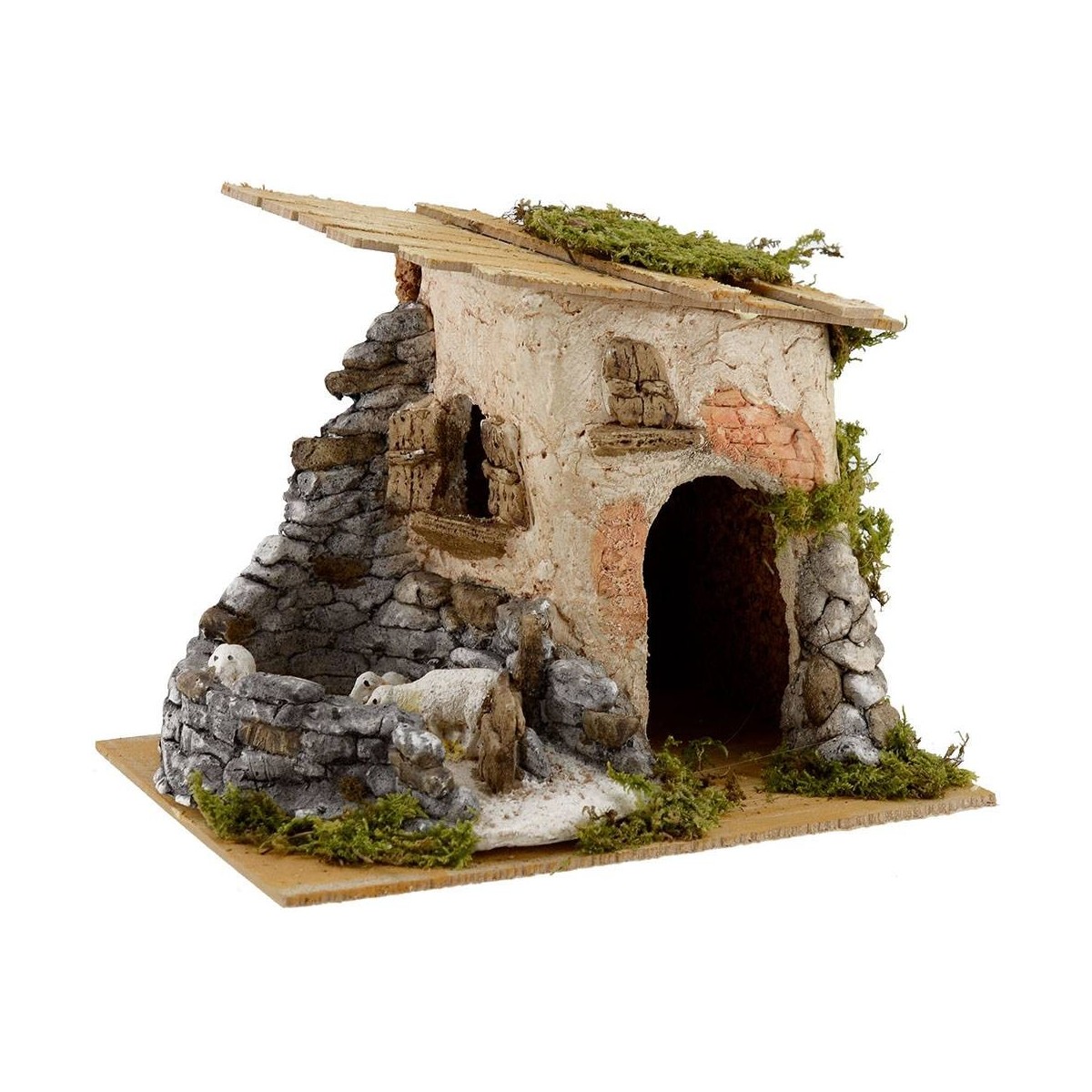 Casas de yeso cerámico y madera, con ovejas en el corral.