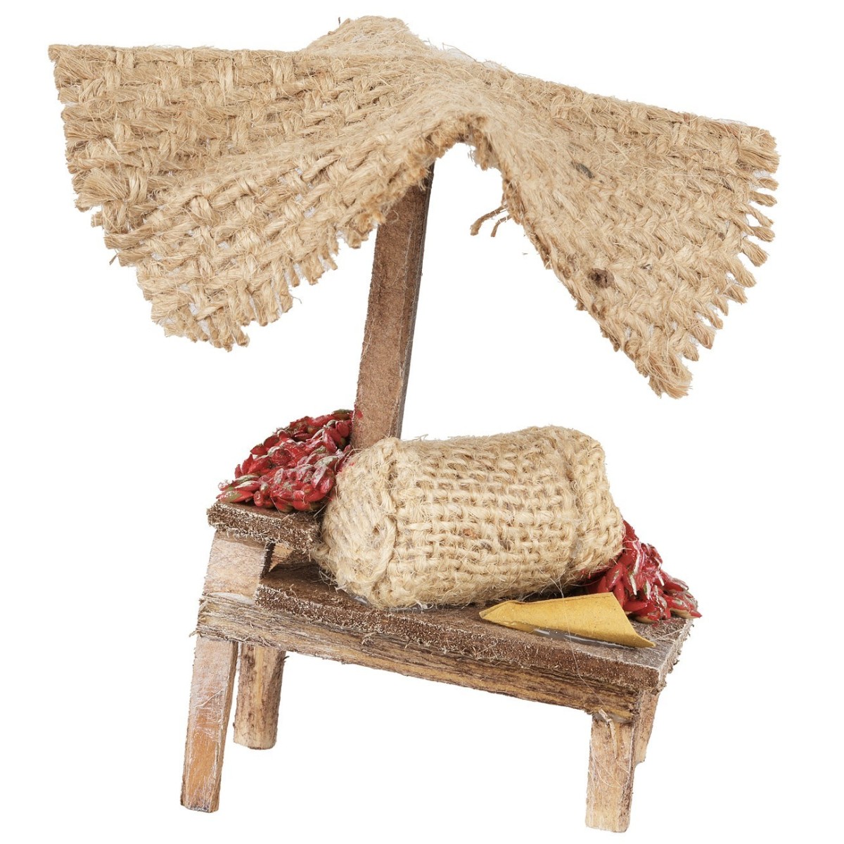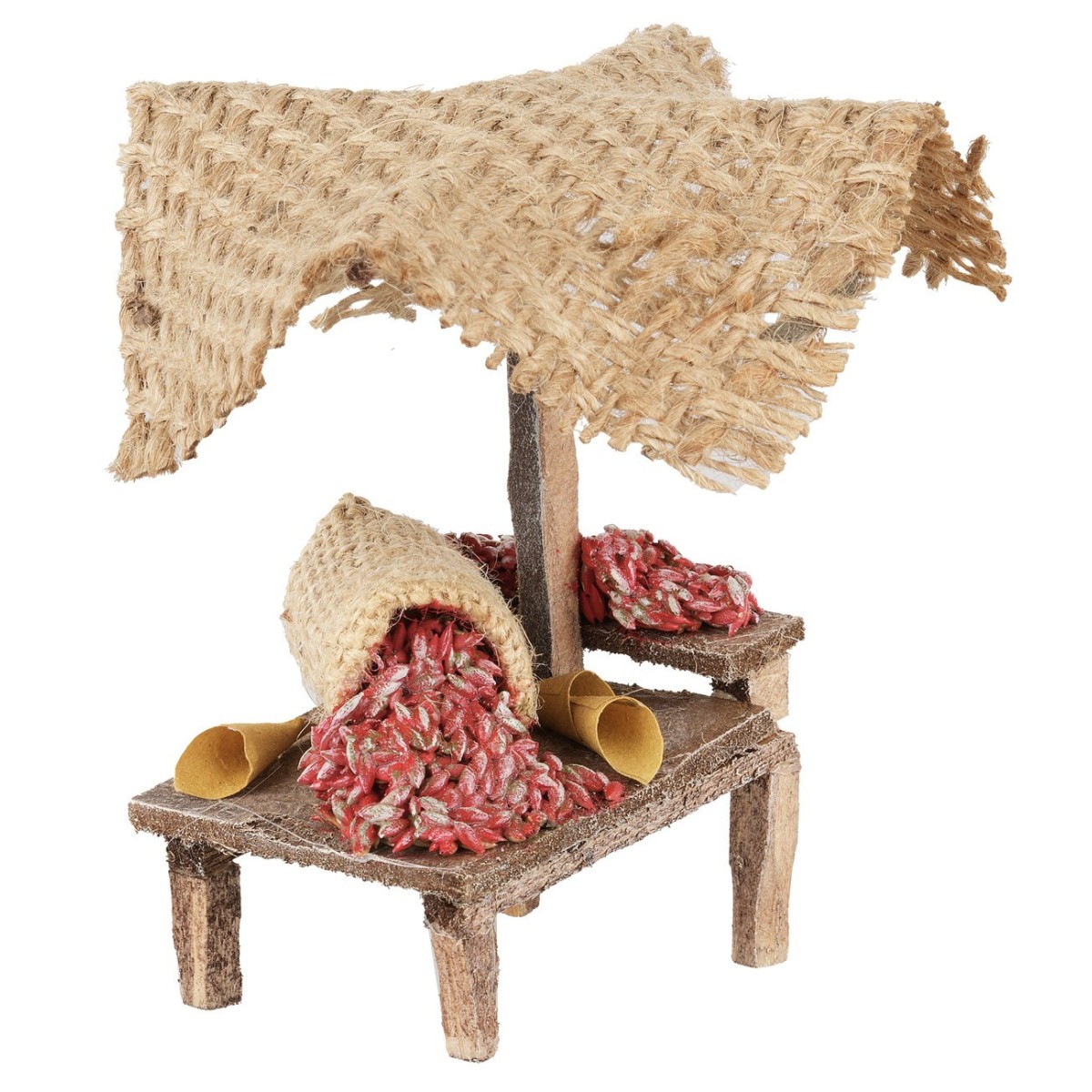 Puesto con saco lleno de pimientos picantes, realizado artesanalmente por sabias manos italianas, en madera y terracota. El producto está bien acabado en los detalles, recomendado para dar un toque de originalidad a su Belén y adecuado para estatuas de altura de 8-10 cm, y se precisa que al ser hecho a mano podría variar ligeramente respecto a la foto.