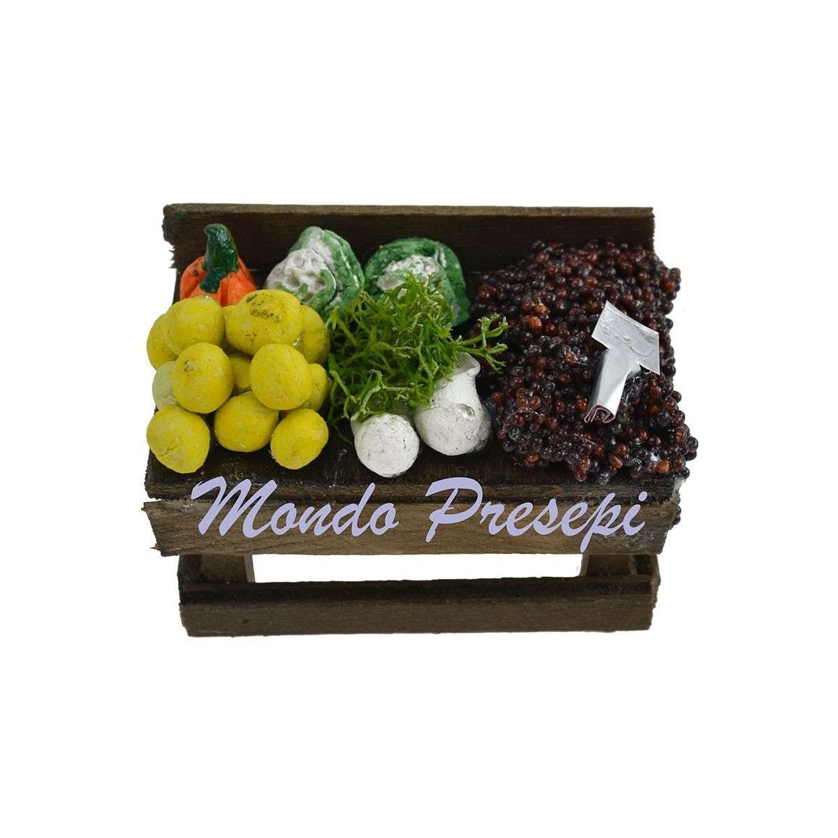Banco de madera con frutas y verduras en modelos surtidos, recomendado para estatuas de altura cm 8-10.
