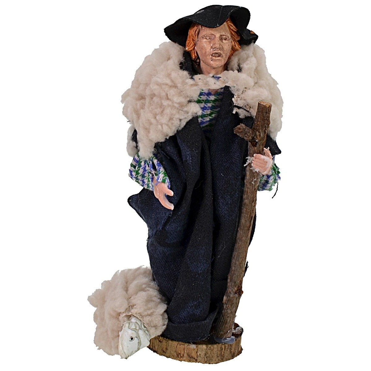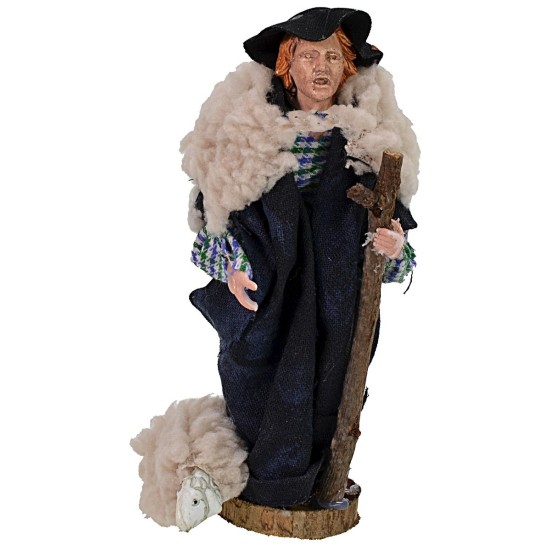 El artículo representa a un pastor vestido con ropa oscura, una piel y un sombrero de ala ancha. Está apoyado en un bastón y a sus pies hay una oveja acurrucada. La estatua es de estilo napolitano y está realizada en terracota vestida. Al ser producida artesanalmente, los colores pueden variar ligeramente.