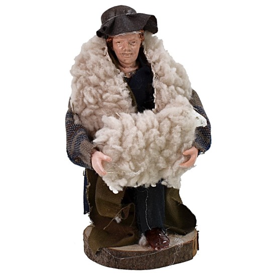 El artículo representa a un pastor arrodillado vestido con ropas oscuras, con una piel blanca y un sombrero negro. En la pierna izquierda descansa un cordero que sostiene entre los brazos. La figurita es de estilo Napolitano y está hecha de terracota vestida. Al ser realizada artesanalmente, los colores pueden variar ligeramente.
