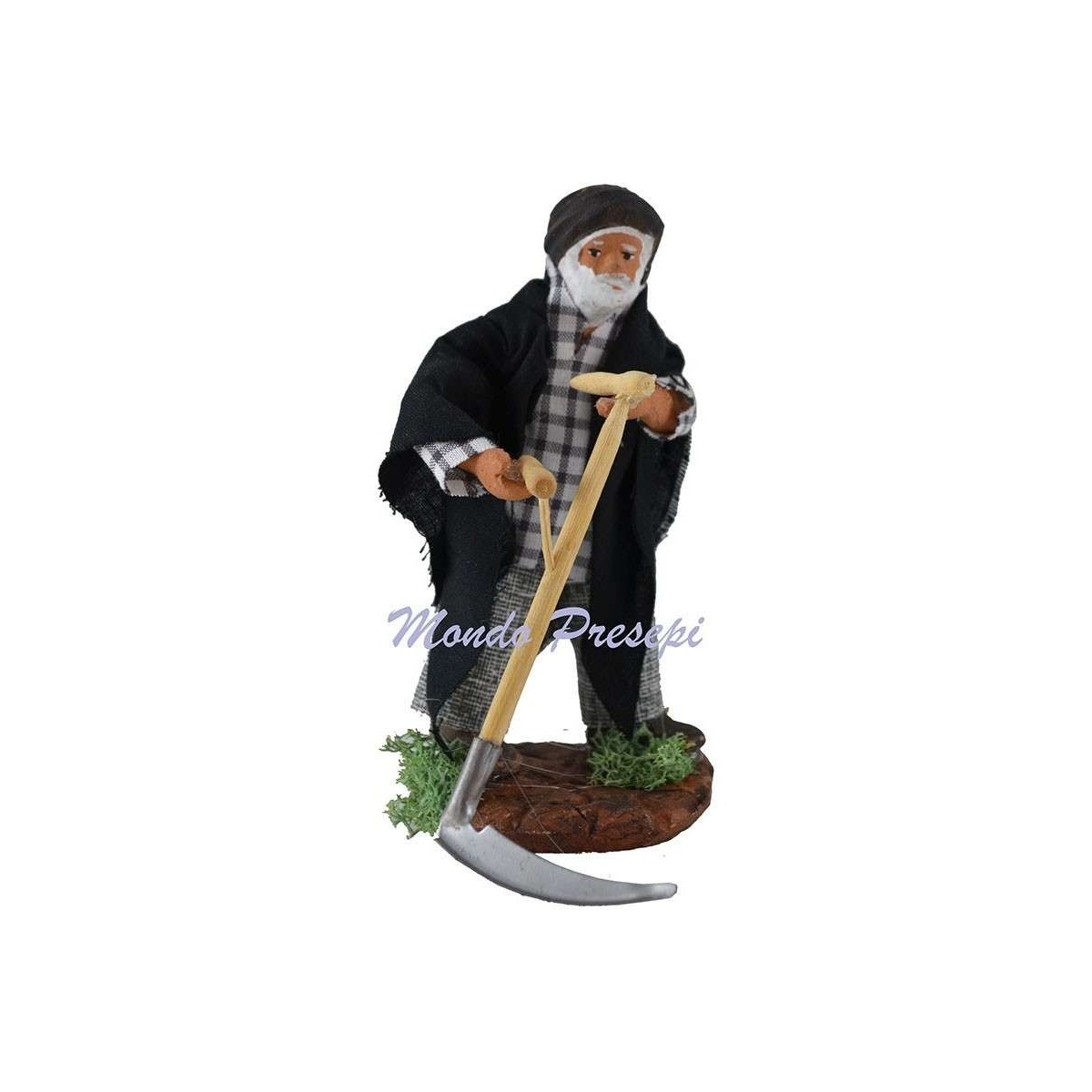 Hombre con hoz de 10 cm, en terracota vestido con tela.