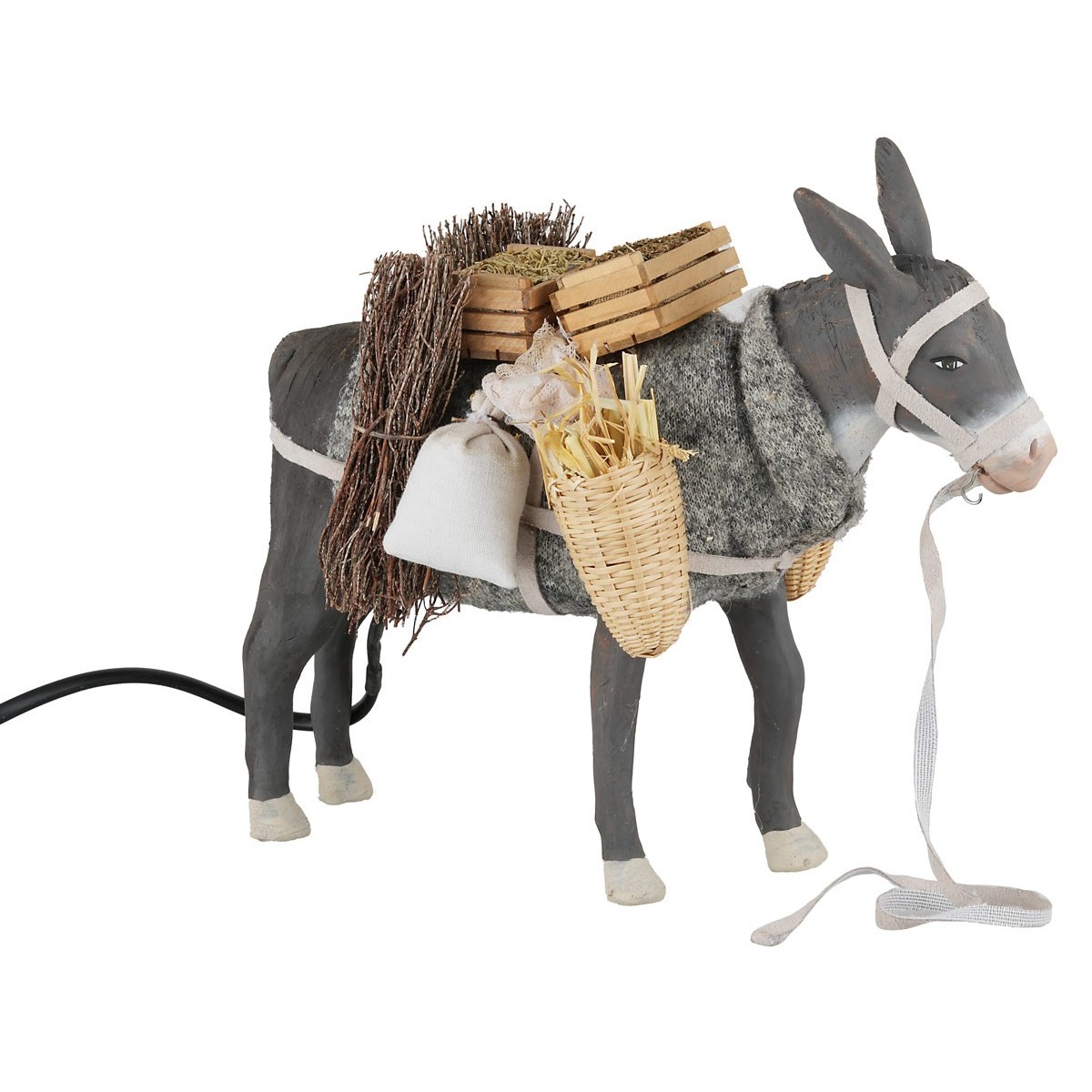 Asno que realiza un movimiento a la derecha e izquierda con la cabeza. Está hecho de terracota y pintado a mano en Italia por hábiles manos artesanas, acabado con telas. El animal está hecho de terracota y funciona con corriente. Se precisa que los detalles del producto pueden variar ya que está realizado artesanalmente.