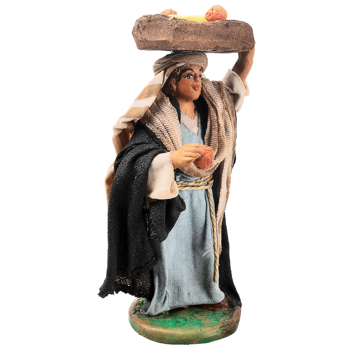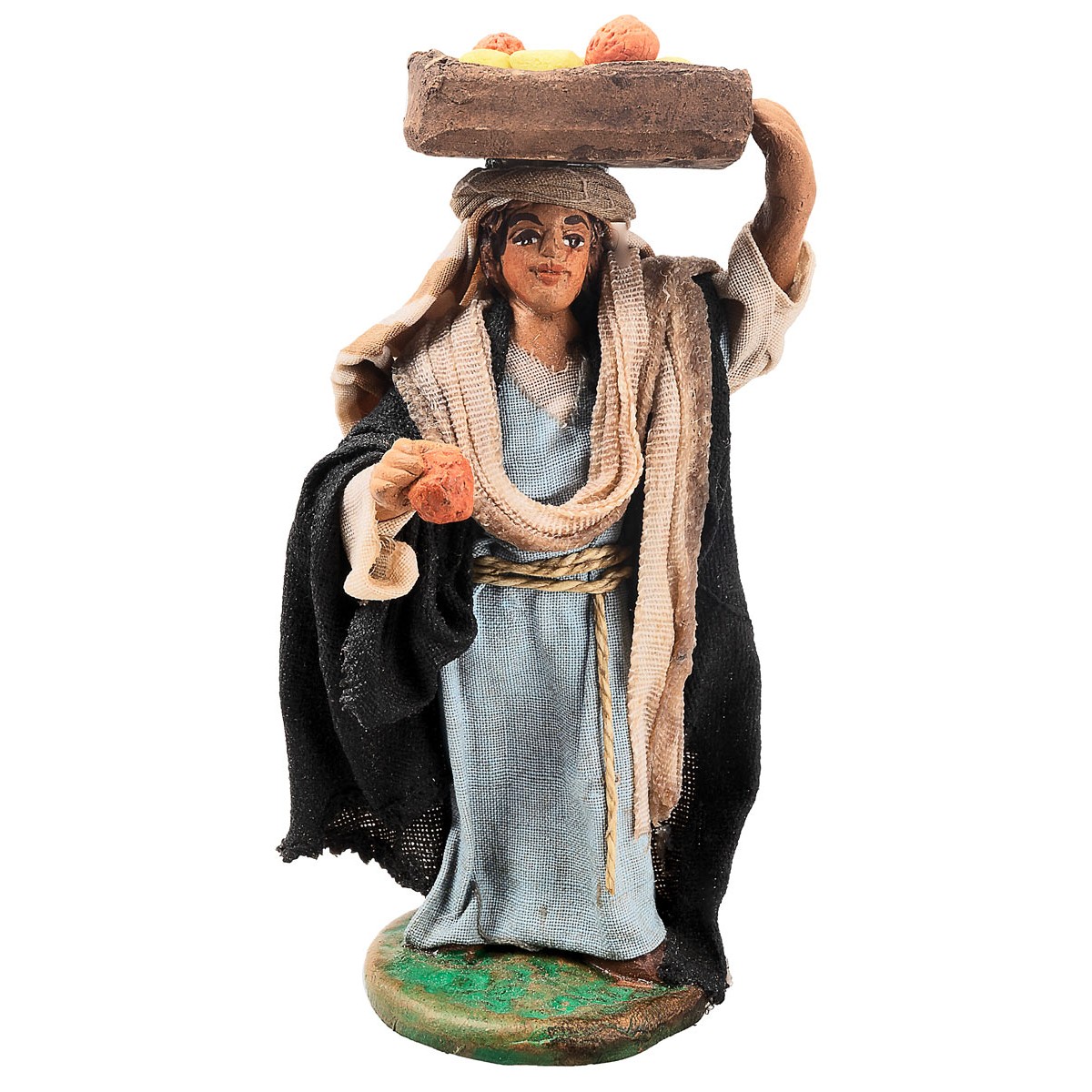 Mujer árabe-palestina con caja de limones y naranjas serie 10 cm. La figura representa a una campesina con ropa de tela endurecida que lleva una caja llena de frutas y sostiene una naranja en la mano, detalle que enriquece la escena. Realizada artesanalmente en terracota y vestida a mano, es ideal para completar belenes de estilo árabe-palestino. Al ser un producto hecho a mano, los colores pueden variar ligeramente respecto a la foto.