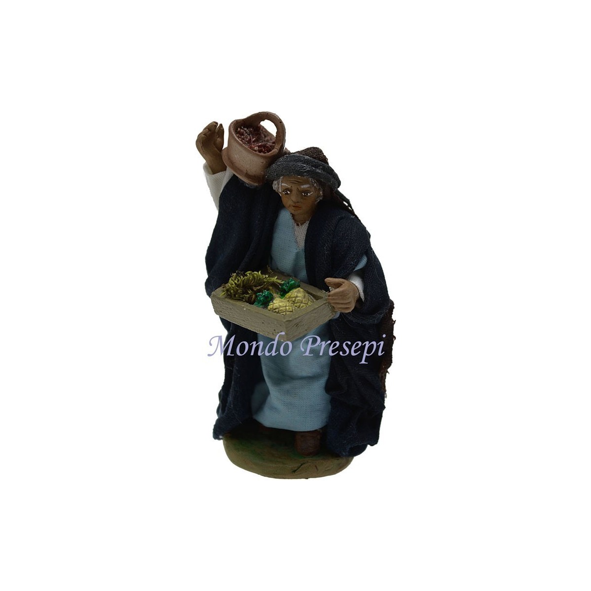 Hombre con caja y cesta de frutas, estatua de terracota artística detallada y vestida con tela endurecida.